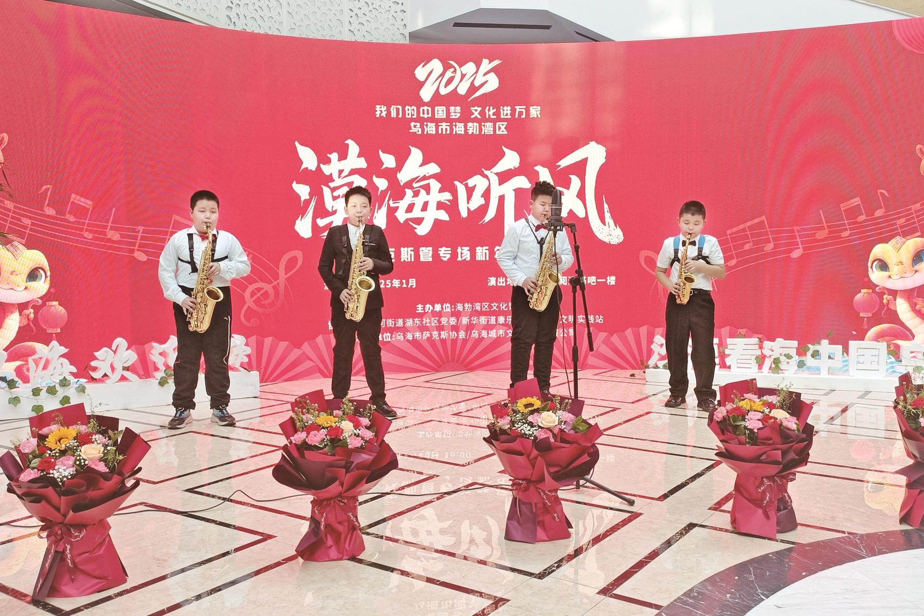 近日,海勃湾区文化馆开展了“漠海听风”萨克斯管专场新春音乐会。活动中,文艺志愿者表演了萨克斯管、小提琴演奏等节目,让居民体验了一次“沉浸式”的视听盛宴。(黄建飞 摄)