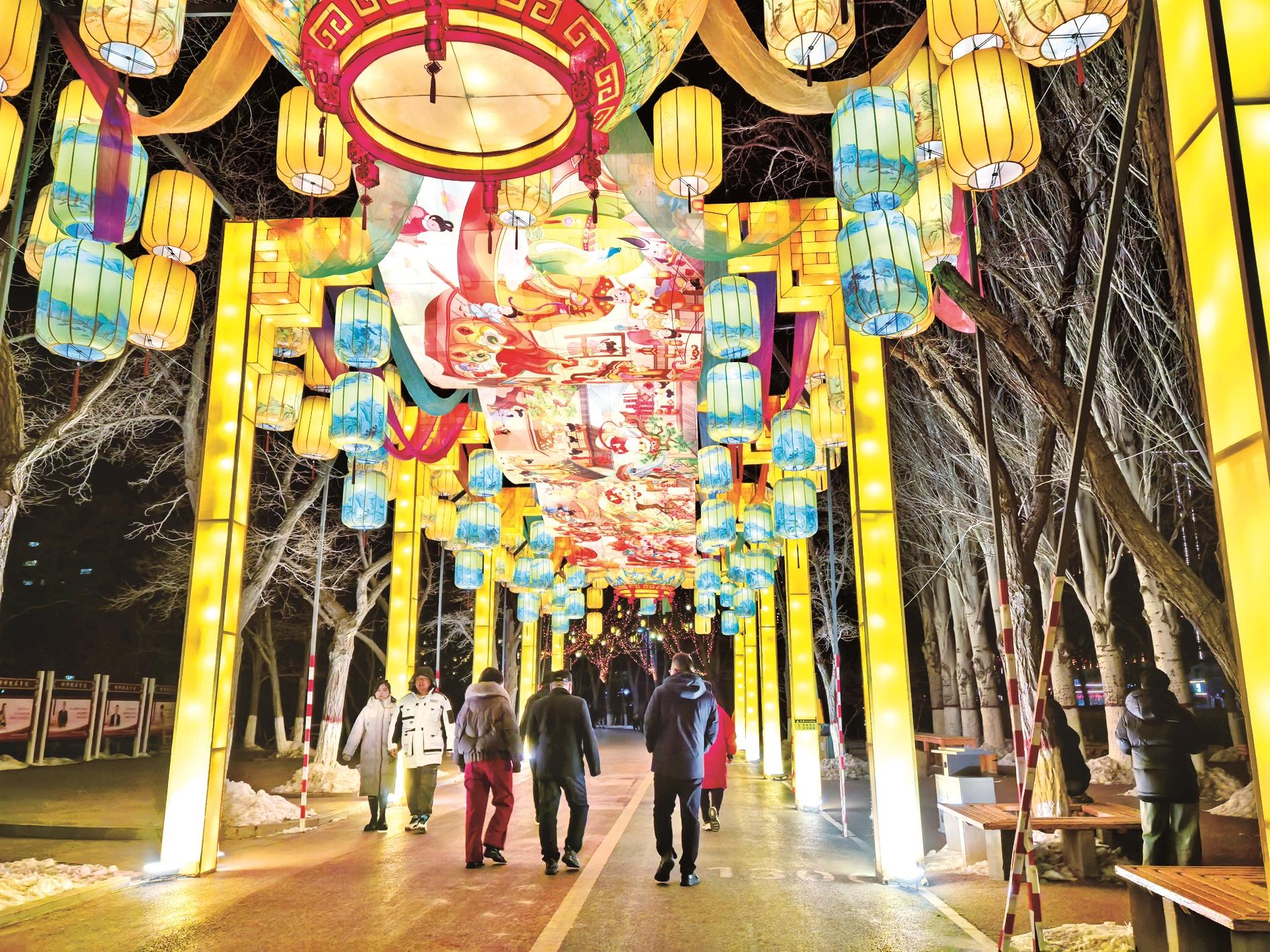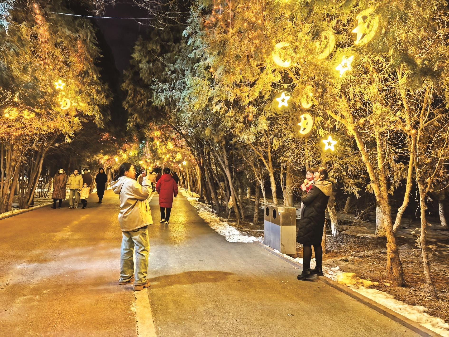 春节期间,市人民公园灯光璀璨,夜色迷人,各式花灯营造出浓浓的节日喜庆氛围。今年,我市推出集赏花灯、逛市集、看表演、品年俗、游景区于一体的新春文化盛会,进一步丰富市民游客的观光体验。 (刘春霞 摄)