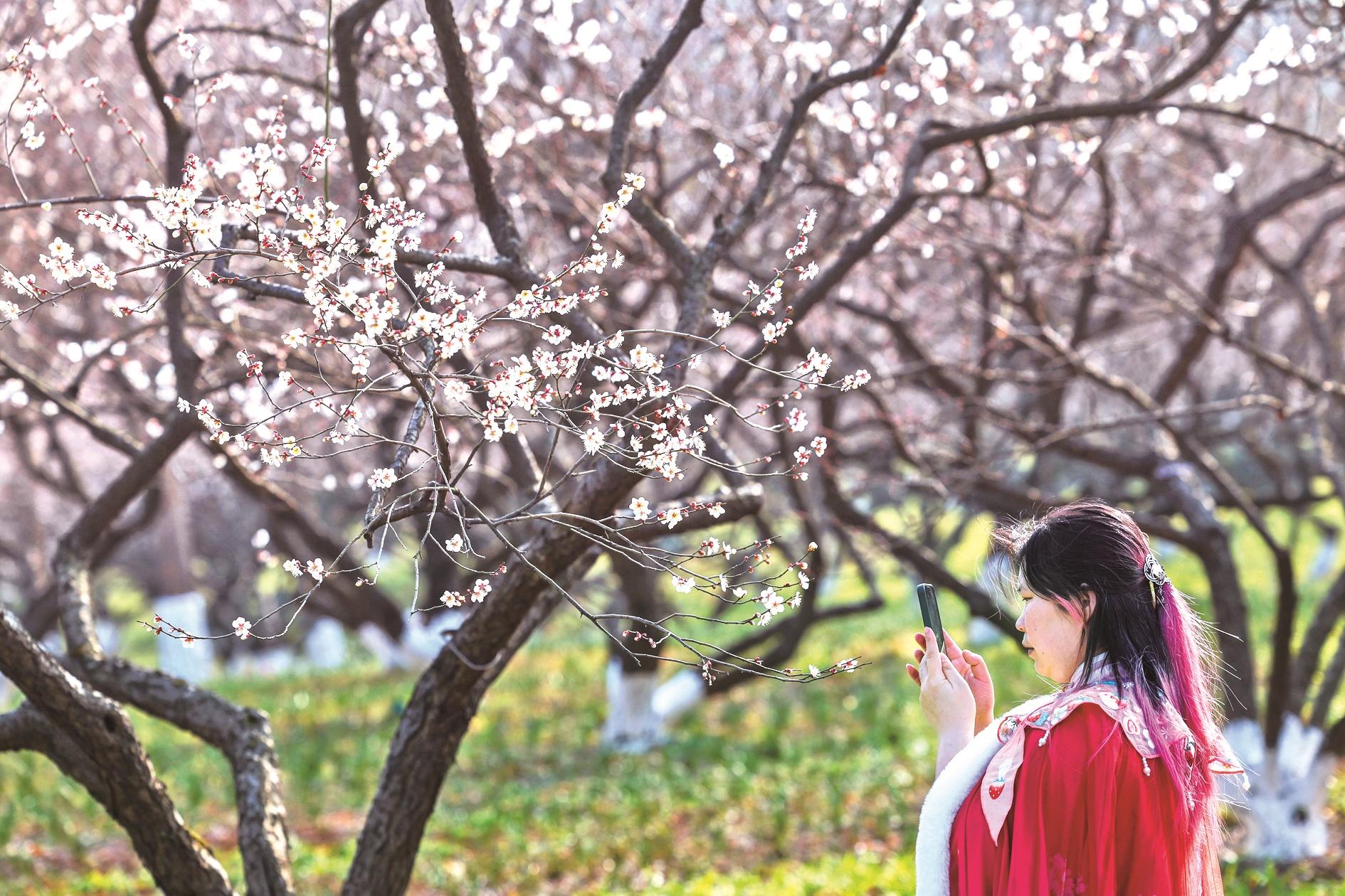 2月3日,游客在超山景区内赏梅。立春时节,浙江省杭州市临平区超山景区内万余株梅花进入盛花期,景区呈现出千树万树梅花开的美丽景色,吸引市民和游客前来赏春踏春。