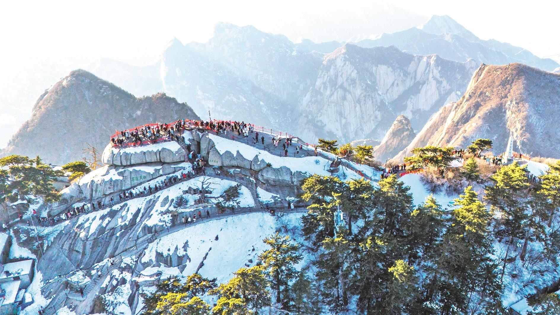 2月3日,游客在华山西峰游览。春节假期,位于陕西省渭南市的西岳华山迎来游览高峰,日均接待游客达2万人次。