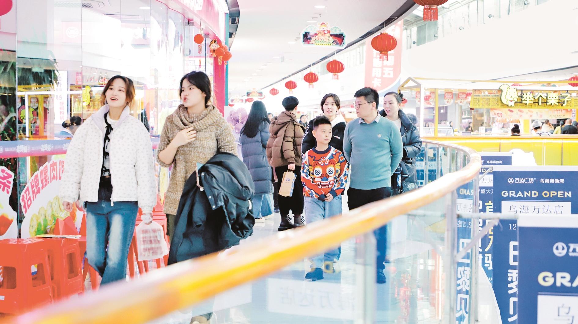 今年春节期间,我市餐饮消费市场烟火气十足,电影市场持续火爆,各大商超纷纷开启“春节模式”,节日消费市场红红火火,活力无限。图为市民在乌海万达广场休闲娱乐。(赵政宇 摄)