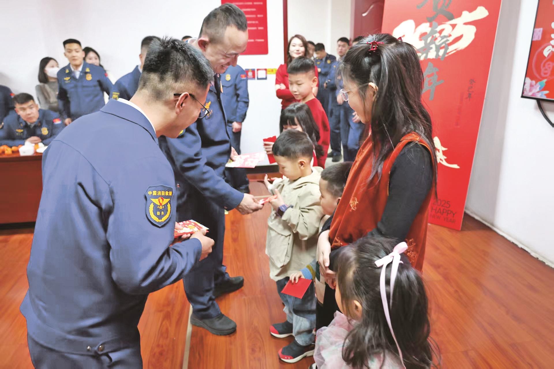 图①:市消防救援支队海勃湾大队光明路特勤站组织迎新春活动,消防员与家人在站里团聚,看节目、吃饺子、发红包,享受新春的欢乐时光。 (张楚研 摄)