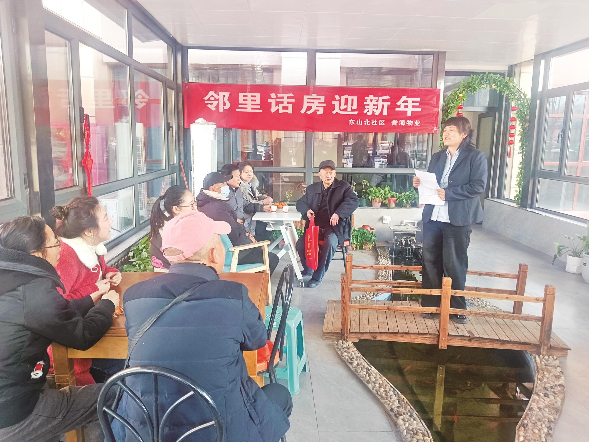 图②:海勃湾区海北街道东山北社区开展新春茶话会,居民、物业工作人员、社区工作人员齐聚一堂,聊过去一年的收获,谈新一年的期望。 (段维娜 摄)