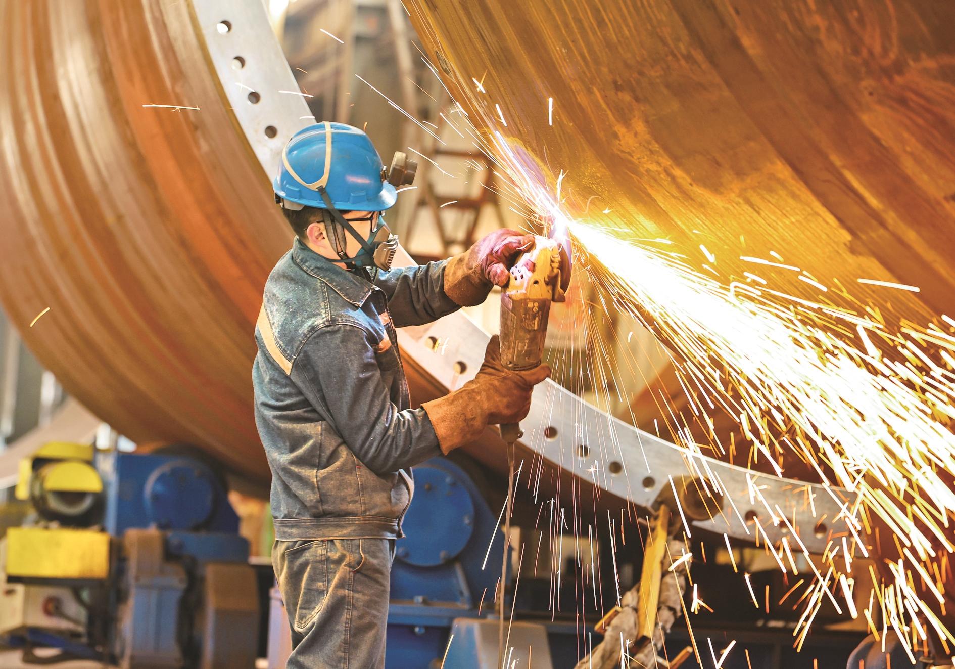 2月5日,江苏省连云港经济技术开发区一家风力设备公司工人在车间内生产风电塔架。 当日是春节假期后首个工作日,各地企业铆足干劲忙生产,力争首季“开门红”。 新华社发(王健民 摄)