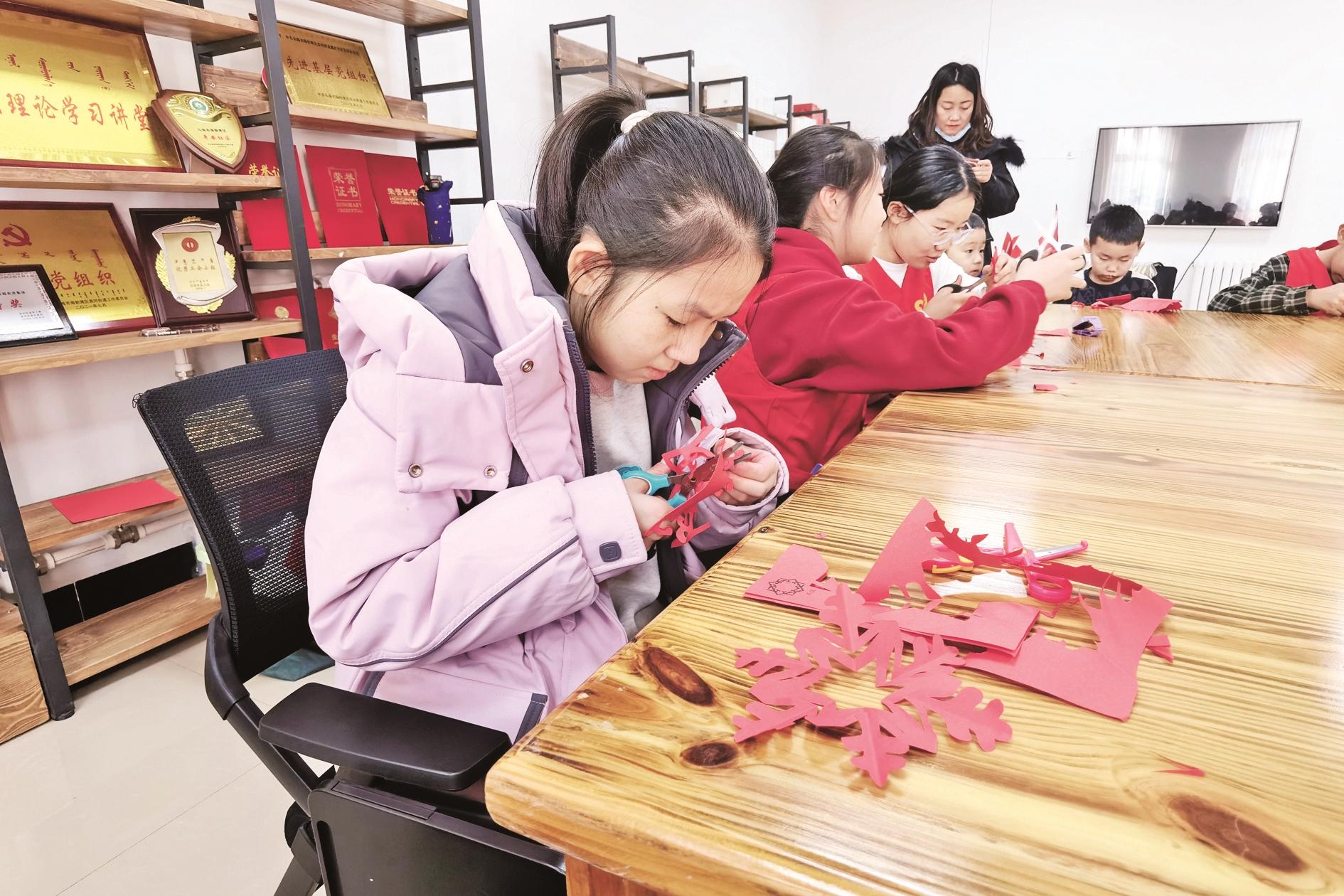 近日,海勃湾区滨河街道镇北社区开展了“非遗剪纸进社区 传统文化润童心”活动。活动中,志愿者向孩子们讲解了中国剪纸的起源与发展,孩子们在志愿者的指导下,剪出一幅幅栩栩如生的作品。 (黄建飞 摄)