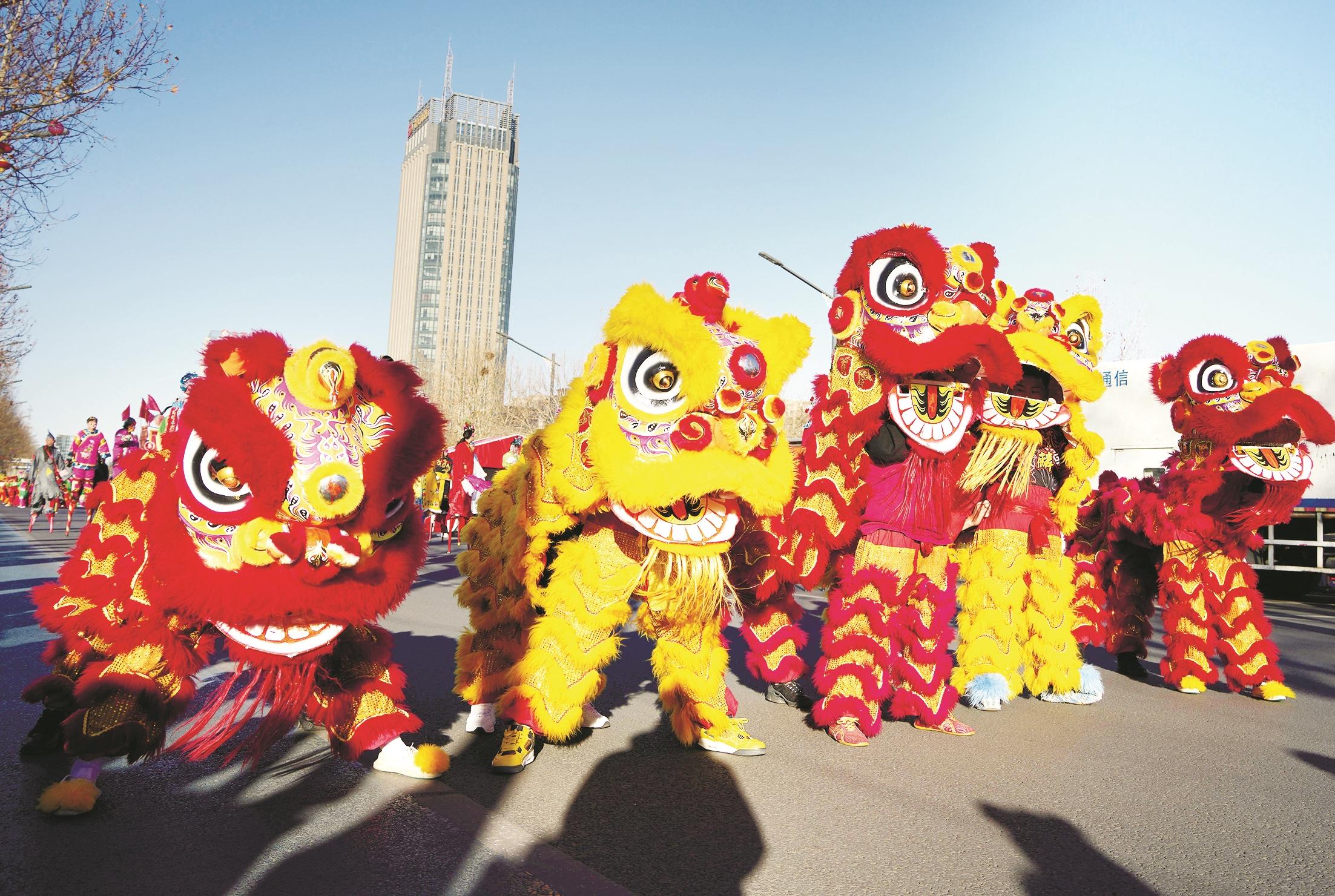 2月8日,在广饶县民俗巡游表演活动上,当地群众进行舞狮表演。当日,山东省广饶县举行民俗巡游表演活动,喜迎元宵佳节,共有1200多名当地群众参加此次民俗巡游表演。 新华社记者 徐速绘 摄