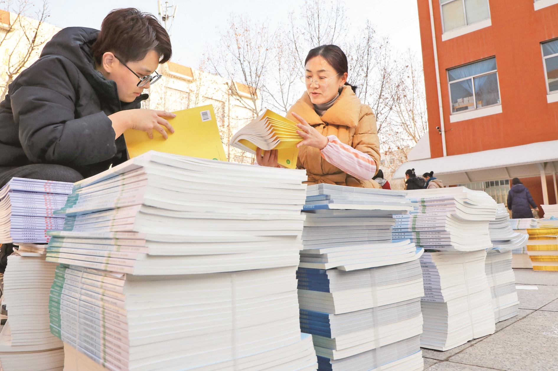 2月10日,山东省滨州市博兴县第一小学教师在清点新学期教材。新学期开学在即,各中小学校教职员工陆续返校,其他相关部门工作人员也开始各项准备工作,迎接新学期的到来。 新华社发(陈彬 摄)