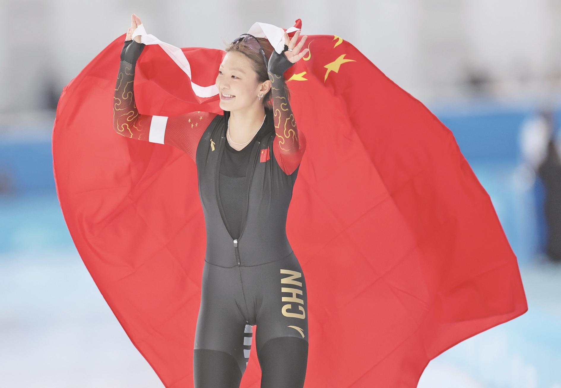 2月10日,杨滨瑜赛后庆祝。当日,第九届亚冬会速度滑冰女子3000米决赛在哈尔滨举行。中国选手杨滨瑜、韩梅、太智恩分别获得冠、亚、季军。 新华社发(兰红光 摄)