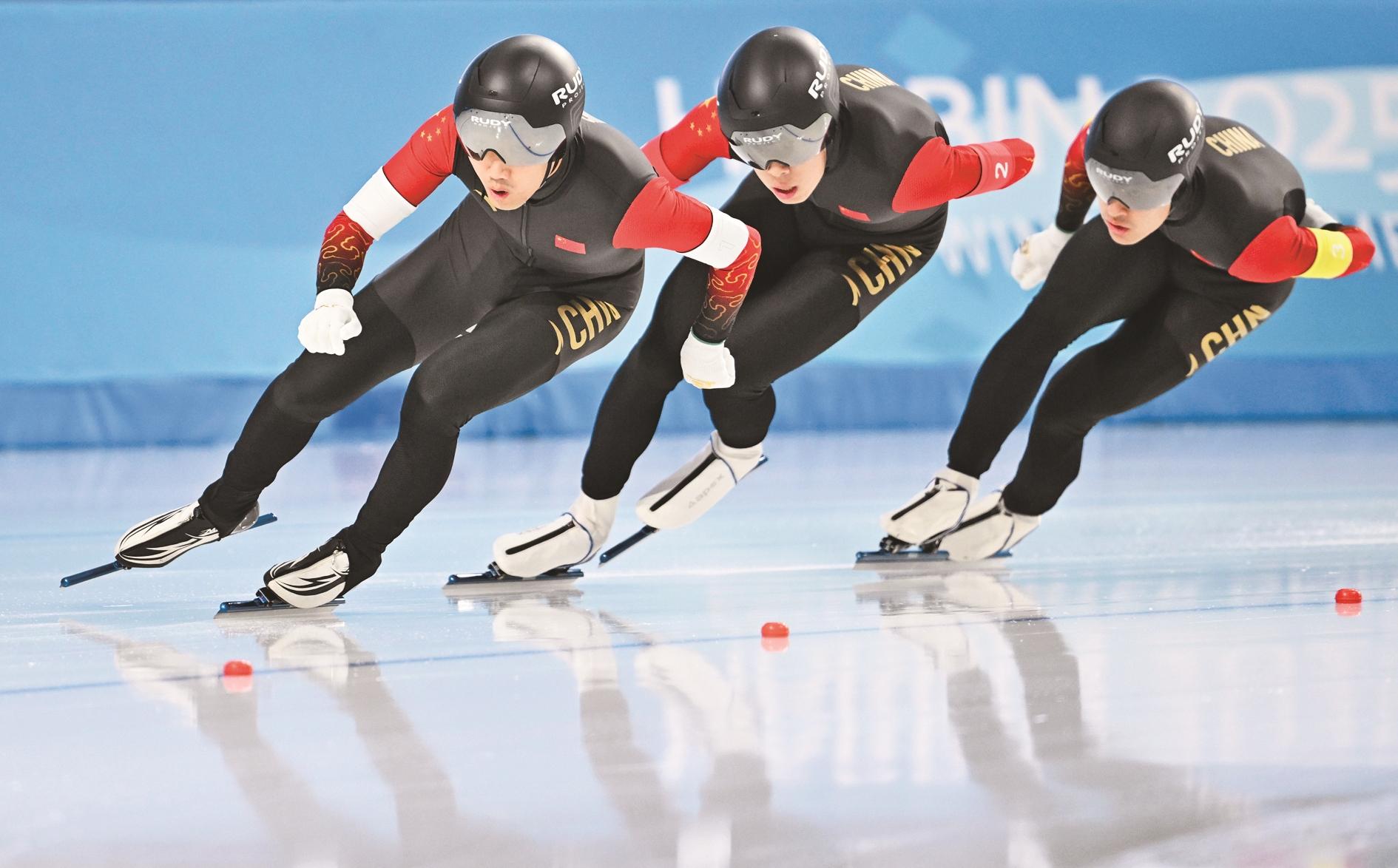 2月10日,中国队选手在比赛中。当日,第九届亚冬会速度滑冰男子短距离团体追逐赛在哈尔滨举行。中国队获得冠军。 新华社记者 陈振海 摄
