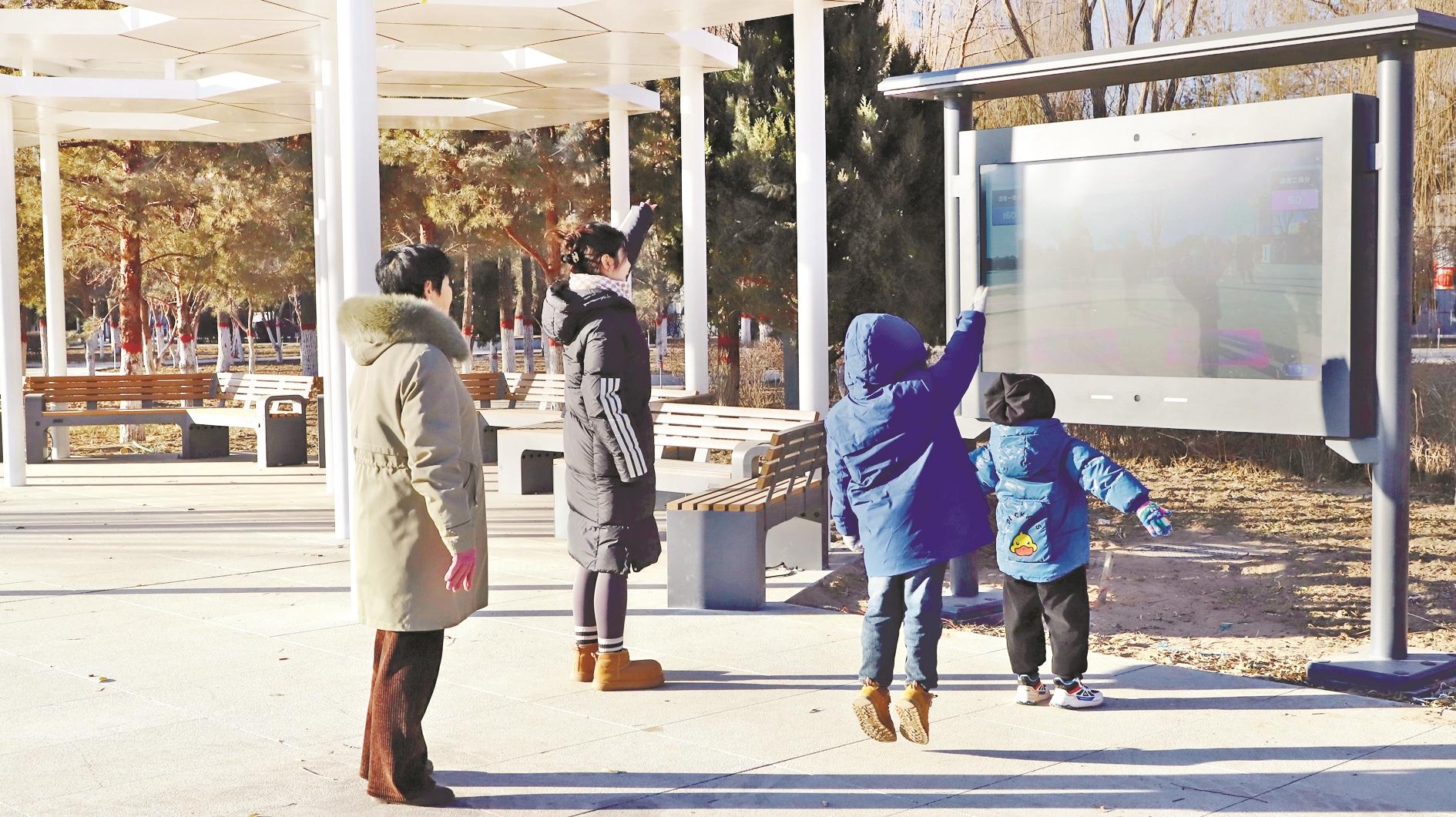改造完成后的市人民广场,除了新增的景观外,还增添了AR互动屏、3D互动投影灯、智慧座椅等数字化公共设施,极大地提升了市人民广场的品质。图为市民在与AR互动屏互动游戏。 (赵政宇 摄)