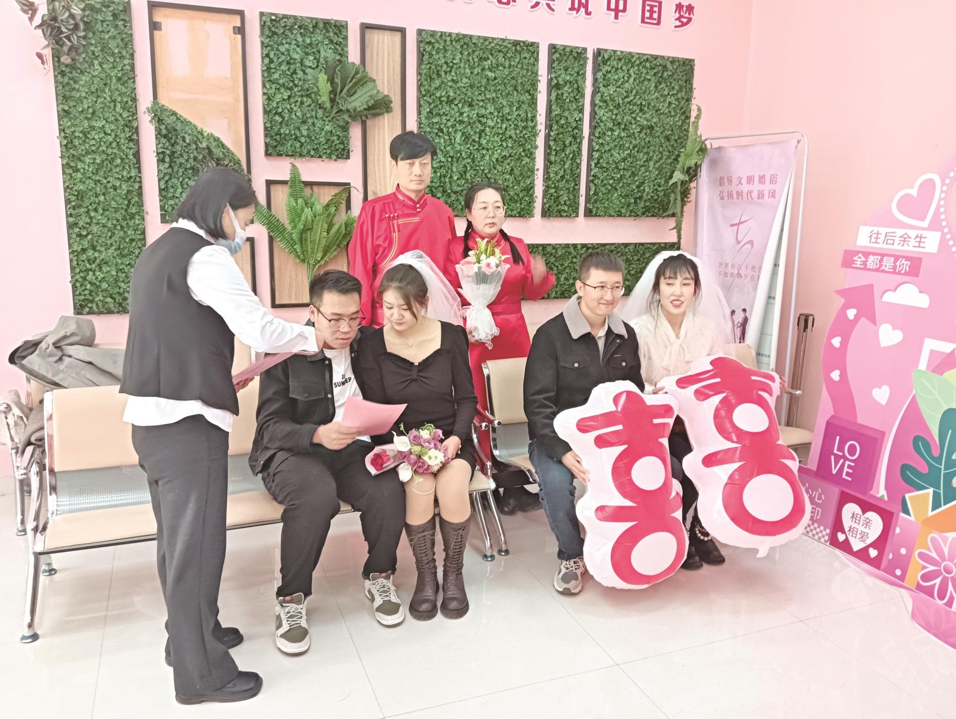 2月14日,乌达区民政局婚姻登记中心为新人供了有纪念意义的结婚登记服务,举办了特别的颁证仪式,旨在持续推进婚俗改革,积极打造特色婚俗文化阵地,广泛动员社会各界参与婚俗改革。 (姚素霞 摄)