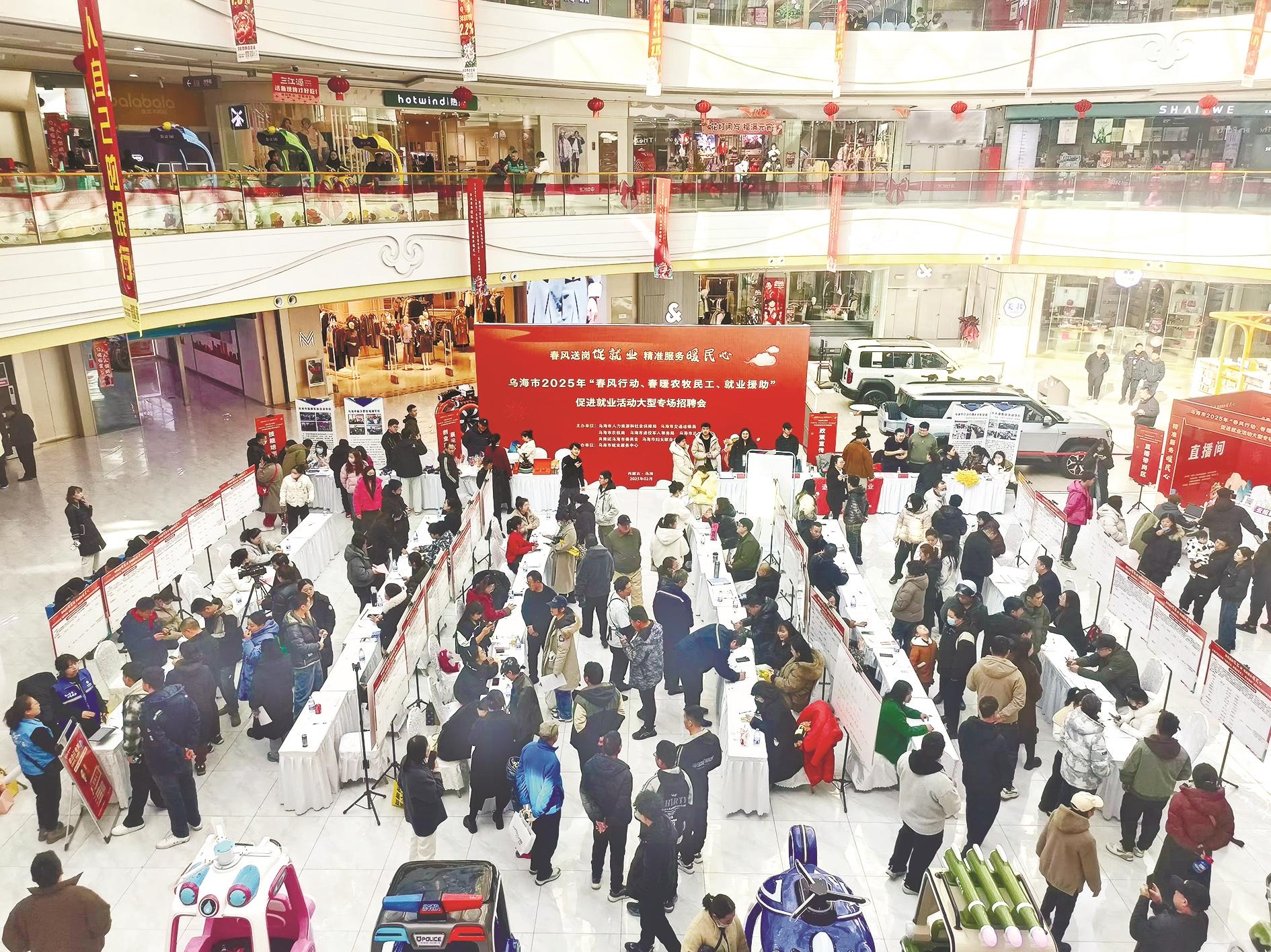 2月12日下午2时,乌海万达广场1号厅内人头攒动。全市2025年“春风行动、春暖农牧民工、就业援助”促进就业活动大型专场招聘会正在这里举行。