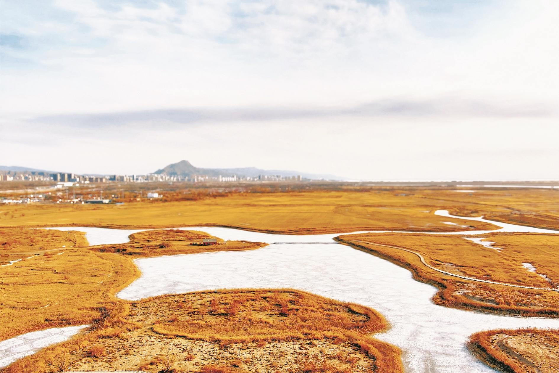 时下,龙游湾国家湿地公园景色宜人,湿地内冰封的河面、棕黄色的芦苇和蜿蜒曲折的步道构成了一幅绝美的“油画”,也成为市民外出游玩、休闲健身的好去处。(王超 摄)