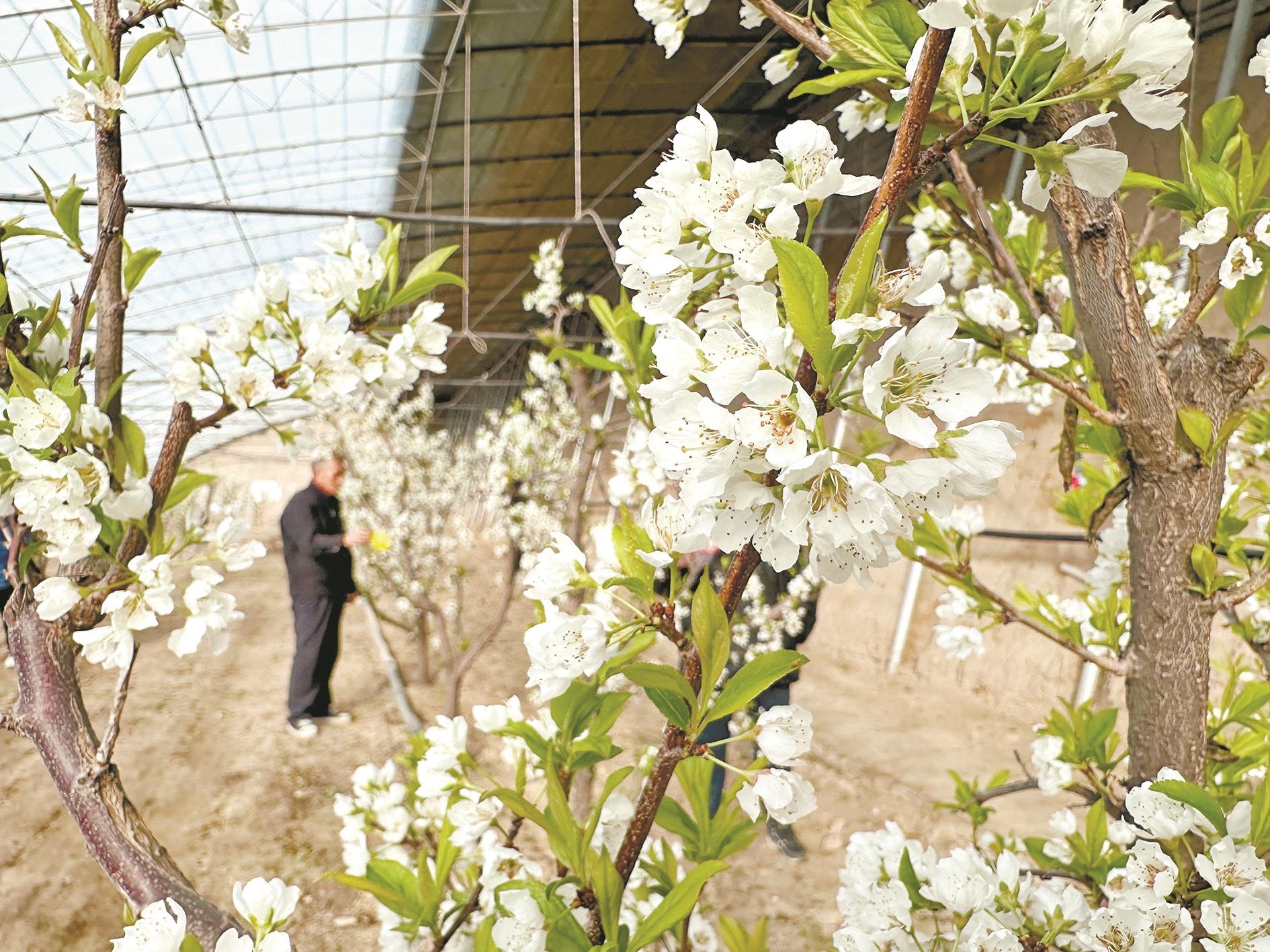 近日,在海南区拉僧庙镇曙光村高效农业示范产业园的温室内,一棵棵李子树整齐排列,枝条上开满了白色的小花,果农们抢抓花期进行人工授粉。近年来,我市充分发挥土地资源优势,持续优化产业结构,整合现有资源,通过引进新品种、新技术,引导种植户大力发展特色种植,使特色种植逐渐成为助农增收的新引擎。 (王蒙 摄)