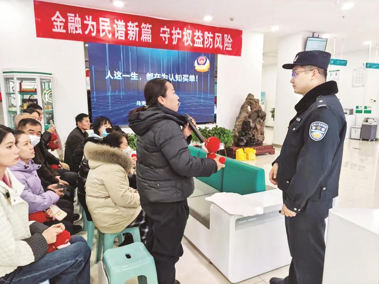 “大家注意啦!‘红包’领取诈骗、冒充客服退款等各类沾着‘年味’的诈骗套路防不胜防……”近日,在乌海万达广场,乌海银行反诈宣传员身披红色绶带,与市公安局民警一起向过往的群众发放宣传折页,结合辖区内发生的典型诈骗案例,通过通俗易懂的语言,介绍常见诈骗手段和防范技巧,帮助广大群众学会识别“新型电信诈骗”套路,远离诈骗陷阱。