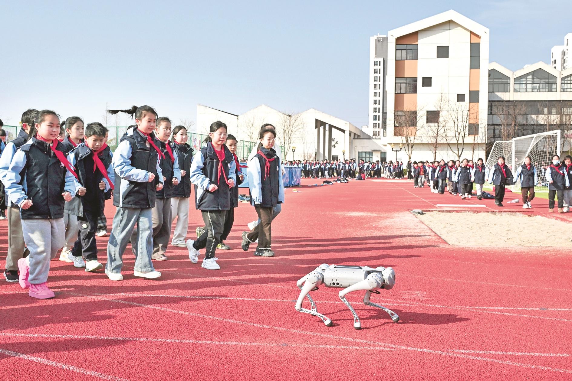 2月19日,在江苏省昆山市信义小学,机器狗带领学生在大课间活动跑步。