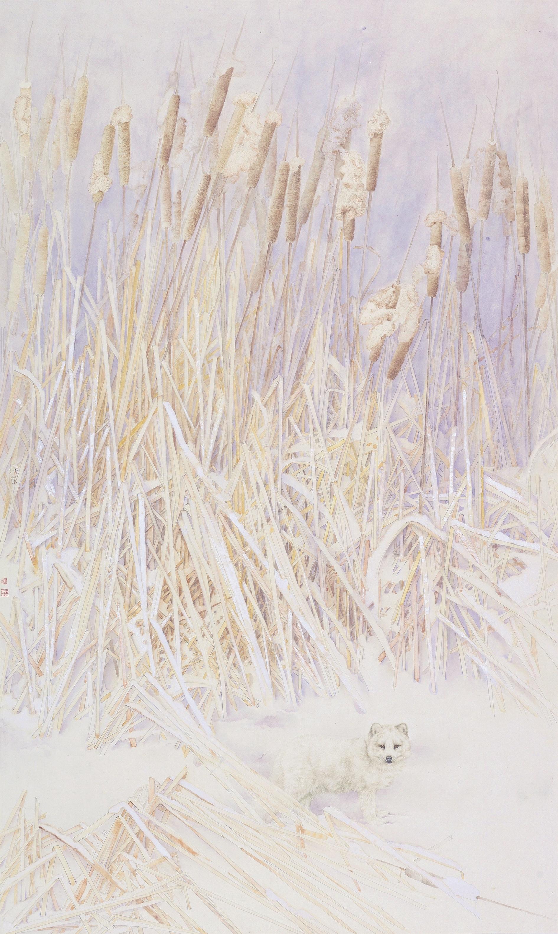 “我画了很多乌海湿地的作品,但总觉得缺少一些灵魂。有一次,我在湿地偶然看到了一只狐狸,它的身影一闪而过,却给我留下了深刻的印象。我想,要是能把狐狸融入画作,说不定能让画面更加生动。”经过反复思考和尝试,郭海荣决定将在湿地看到的土黄色狐狸,艺术加工成白狐融入画作。“白色的狐狸给人一种神秘而灵动的感觉,我觉得它可以为画面增添一份独特的魅力。”