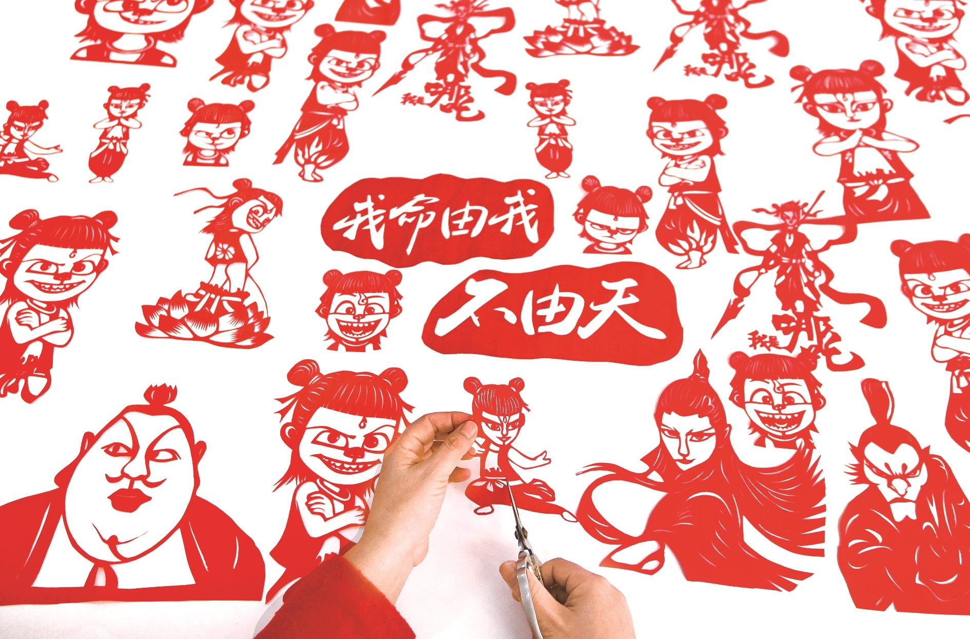 2月13日,河北省邯郸市一名剪纸艺人在创作哪吒主题剪纸作品。近日,随着《哪吒之魔童闹海》电影热映,全国多地的艺术爱好者发挥奇思妙想,根据动画电影创作多种形式的作品。