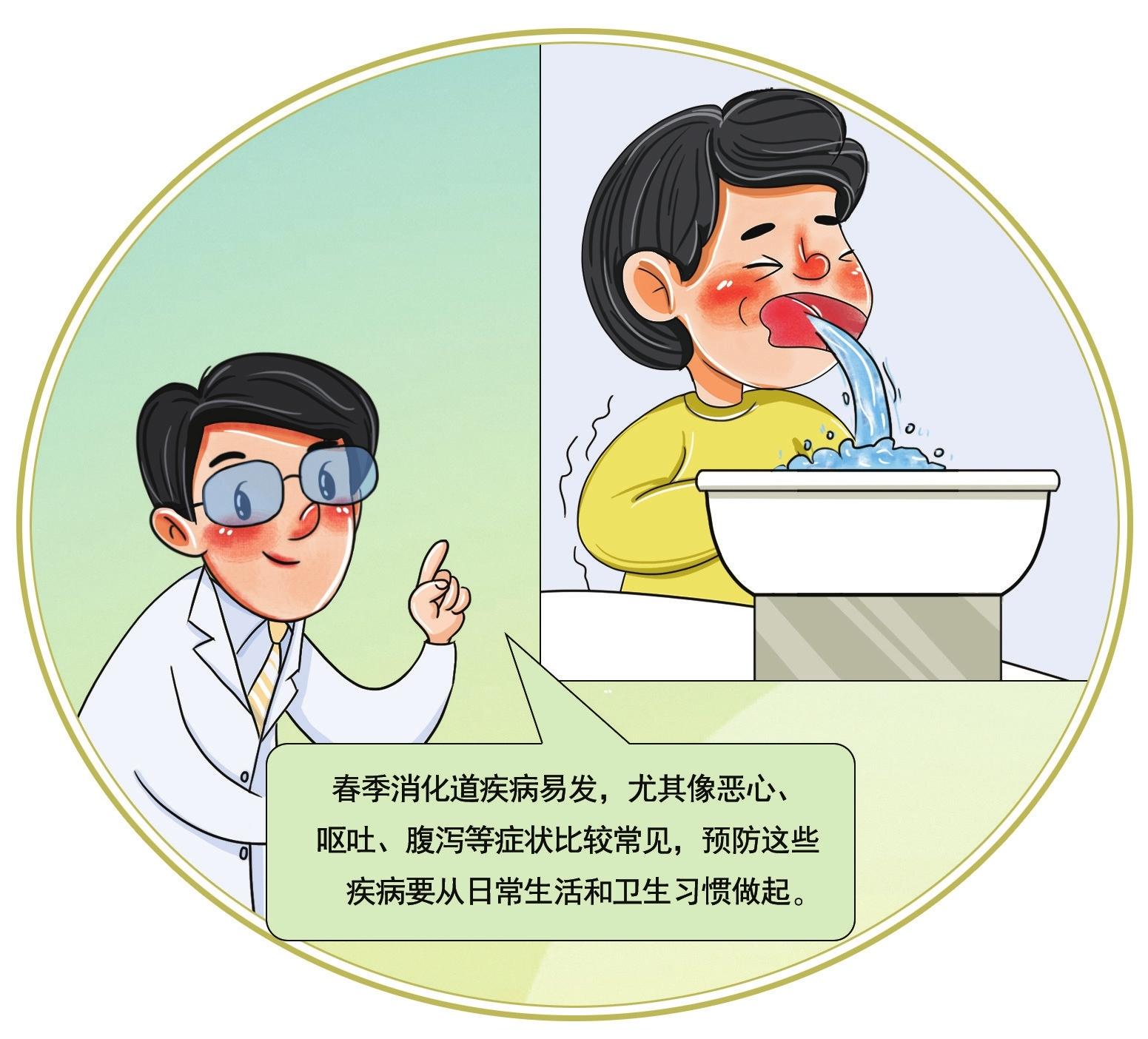 春季气温波动大,人体的植物神经功能容易发生紊乱,导致胃肠道蠕动和消化液分泌失调,胃炎和腹泻等胃肠道疾病也随之增多。“胃炎患者常出现上腹部疼痛、腹胀、恶心、呕吐等症状,腹泻则表现为排便次数增多、粪便稀薄。感染诺如病毒、轮状病毒后患者会出现恶心、呕吐、腹泻等。”宋茹告诉记者,每年10月到次年3月,是诺如病毒感染的高发季节。诺如病毒胃肠炎是由诺如病毒引起的急性肠道传染病,常在学校、托幼机构、养老院等人群聚集单位引起流行性传播。一旦感染诺如病毒,成年人主要表现为腹泻,而儿童则以呕吐症状为主,又称为“冬季呕吐病”,常见表现有恶心、呕吐、发热、腹痛和腹泻,部分患者有头痛、畏寒和肌肉酸痛等。宋茹说,诺如病毒胃肠炎属于自限性疾病,目前尚无有效的抗病毒药物。多数患者发病后症状轻,无须治疗,休息2到3天即可康复,可口服糖盐水或口服补液盐补充呕吐和腹泻消耗的水分。对于婴幼儿和老人,特别是伴有基础性疾病的老人,如因频繁呕吐或腹泻出现脱水等较严重的症状时,应及时就医治疗。