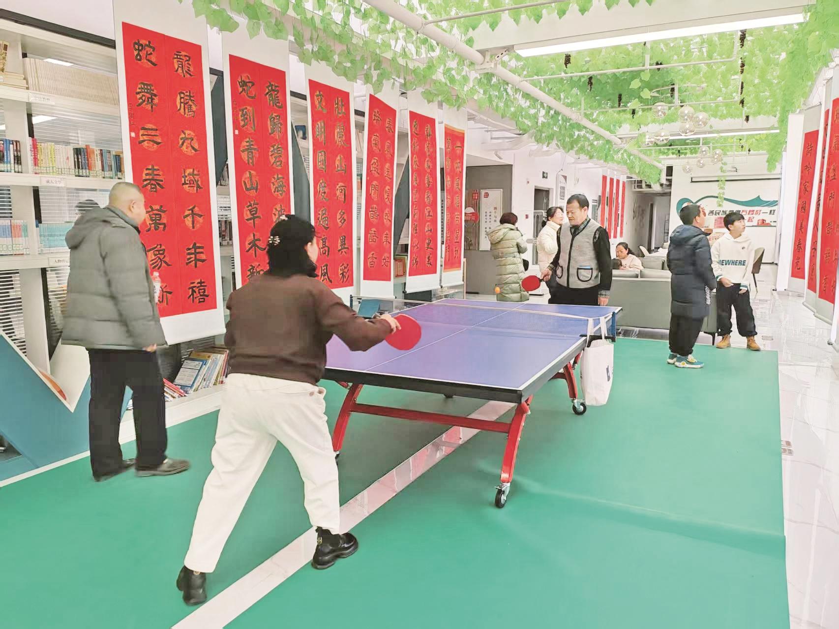 近年来,我市各社区充分利用空间,设置运动休闲场所,丰富居民精神文化生活。图为日前海勃湾区凤凰岭街道居民在活动室打乒乓球、观展。 (张楚研 摄)
