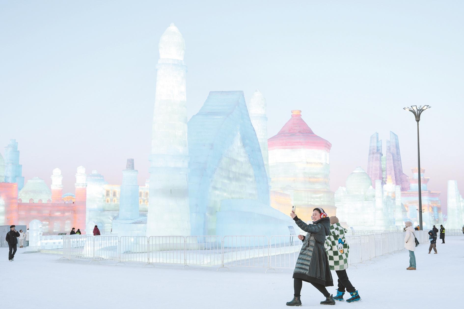 2月26日,游客在哈尔滨冰雪大世界园区内游玩拍照。春暖冰城,告别将至,第26届哈尔滨冰雪大世界于2月26日正式闭园。本届冰雪大世界以“冰雪同梦 亚洲同心”为主题,总体规划面积100万平方米。园区运营以来,游客接待量创下新高。哈尔滨冰雪大世界是黑龙江冬季旅游的特色名片,成为我国冰雪经济蓬勃发展的生动注脚。 新华社记者 王建威 摄