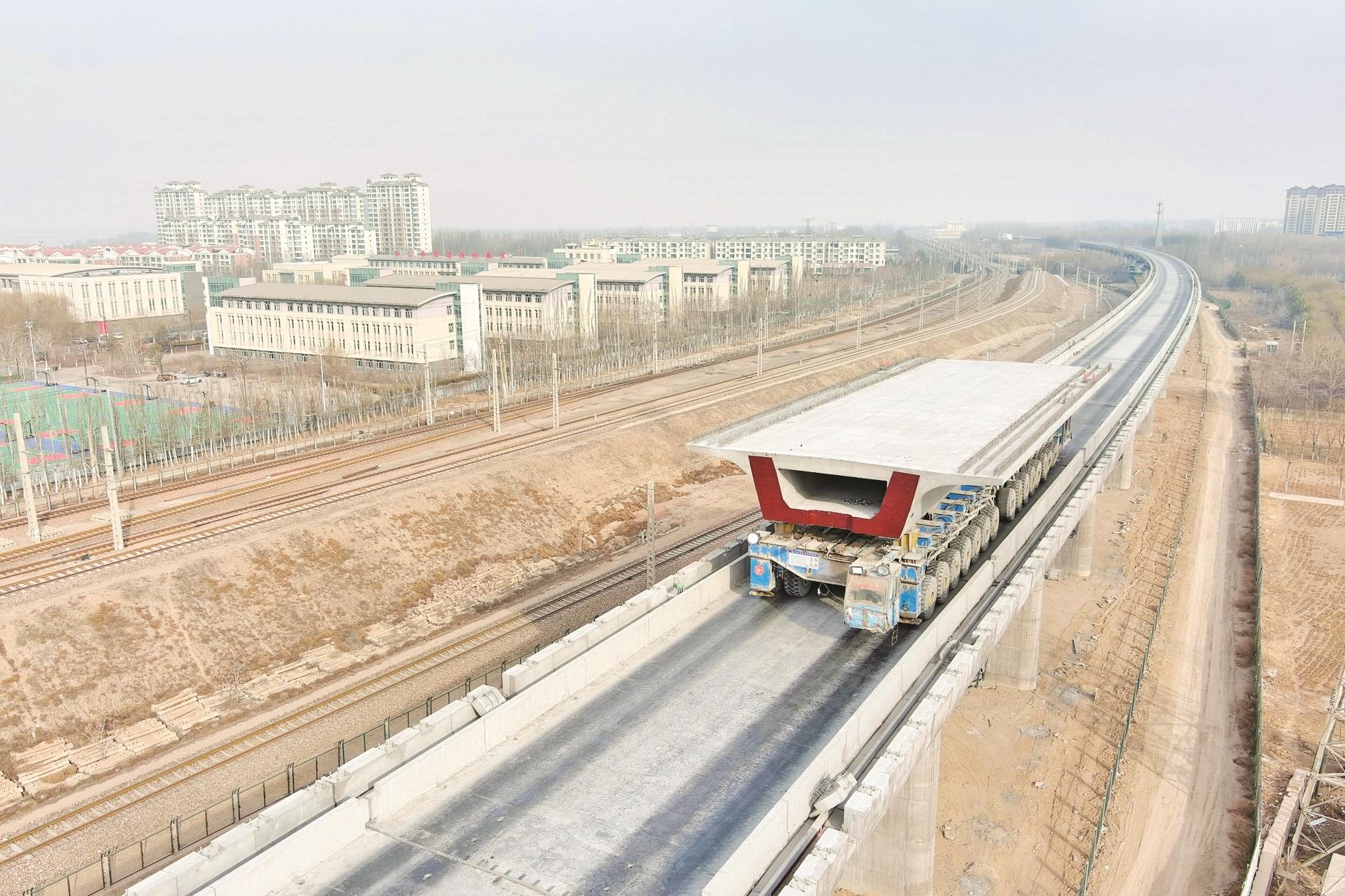 初春时节,包银高铁乌海段项目按下建设“快进键”,处处是如火如荼的建设场面,施工人员利用晴好天气加快施工进度,确保项目早日建成。图为3月1日拍摄的运梁车正通过高铁乌海段路基运送箱梁(无人机照片)。(王超 摄)