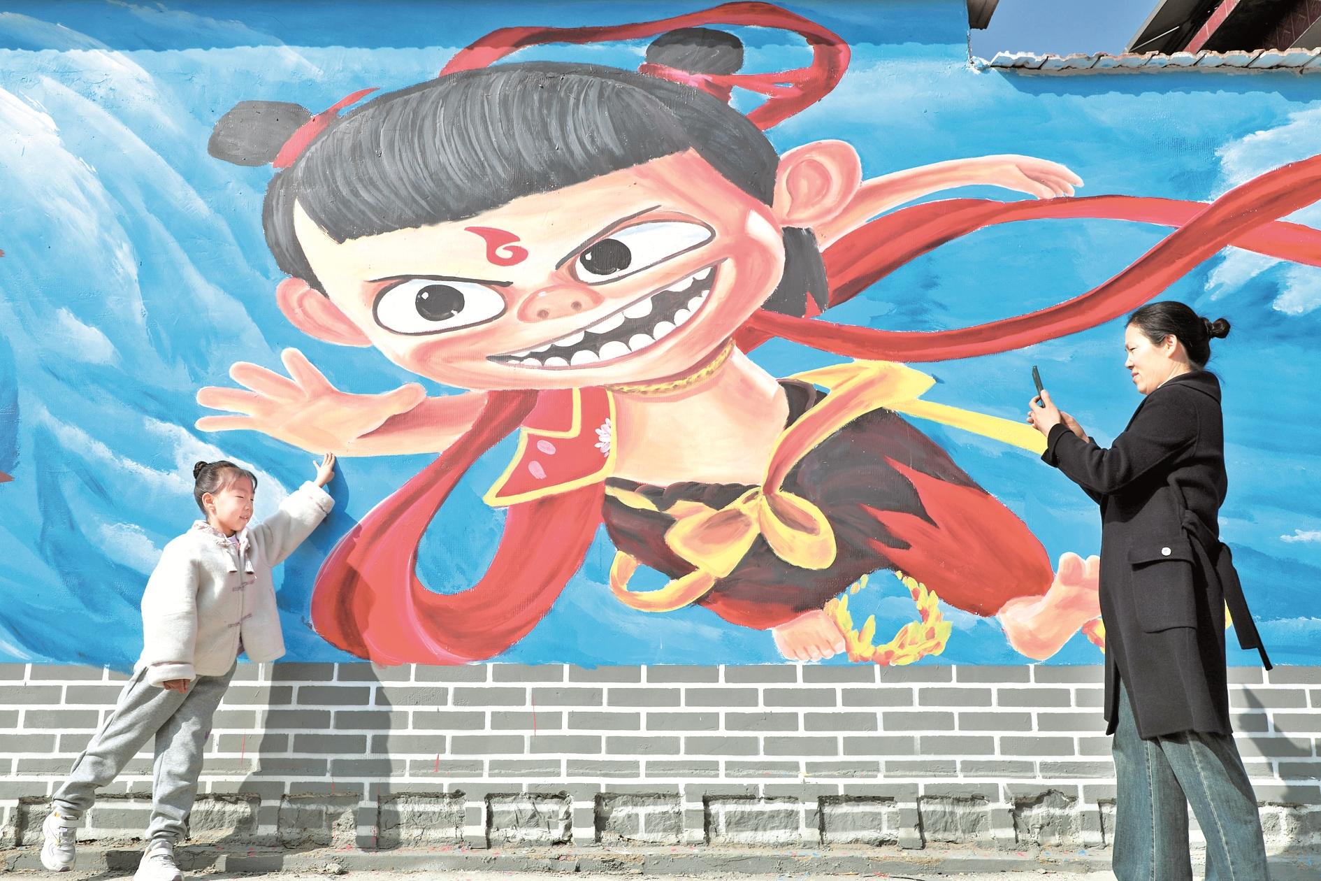 3月1日,人们在山东省滨州市博兴县乔庄镇东冯村的哪吒主题墙绘前拍照。近日,随着《哪吒之魔童闹海》电影热映,各地哪吒主题墙绘吸引人们打卡拍照。