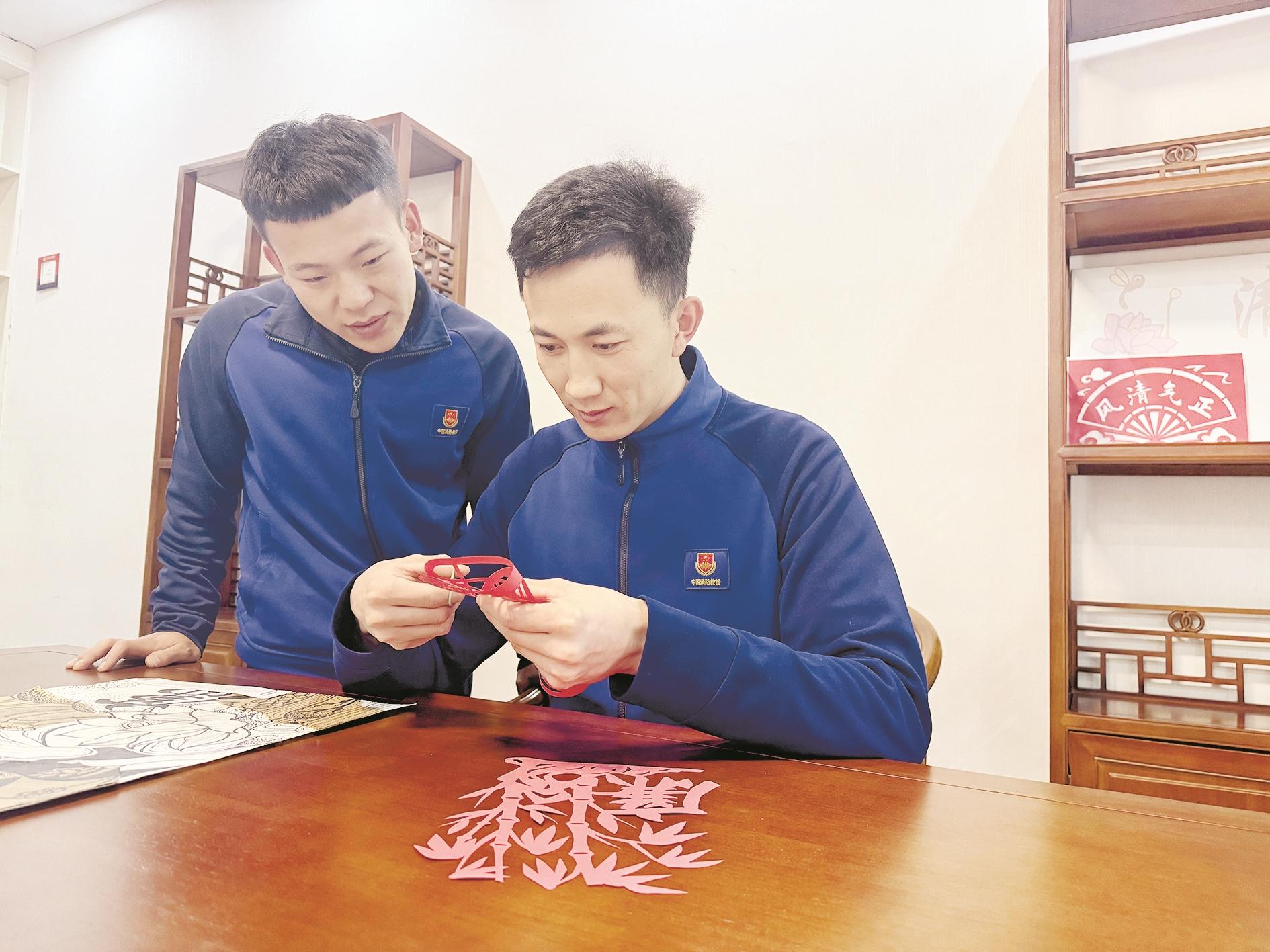 2月28日,乌海市消防救援支队光明路特勤站举办了“非遗里的清廉”剪纸活动,旨在做好廉洁文化建设,倡导崇廉尚洁时代新风,弘扬廉洁自律优秀传统美德。图为光明路特勤站消防员在剪纸。 (张靖爽 摄)