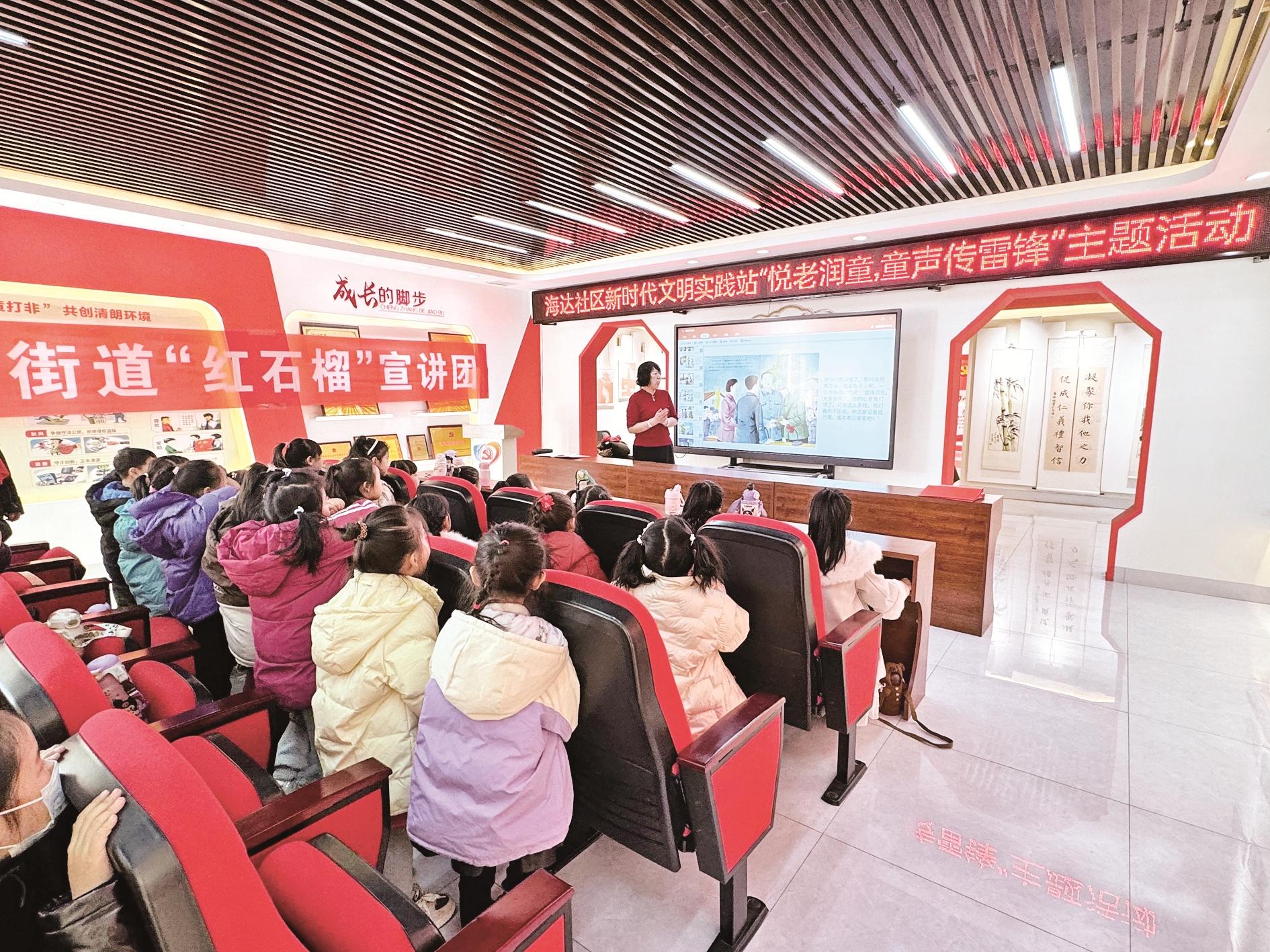 “我知道!雷锋叔叔是一个好人,他很热心,在车站帮助过老奶奶……”近日,海达社区新时代文明实践站组织开展“悦老润童,童声传雷锋”主题活动。现场,新华西街道“红石榴”宣讲团成员通过“宣讲+图文展示”的方式,讲述了雷锋同志的感人事迹。“我退休前就在学校工作,退休后很庆幸能为社区做一些事情,只要身体允许,我将继续为呵护辖区未成年人成长作贡献。”“红石榴”宣讲团成员武蒙娟说。