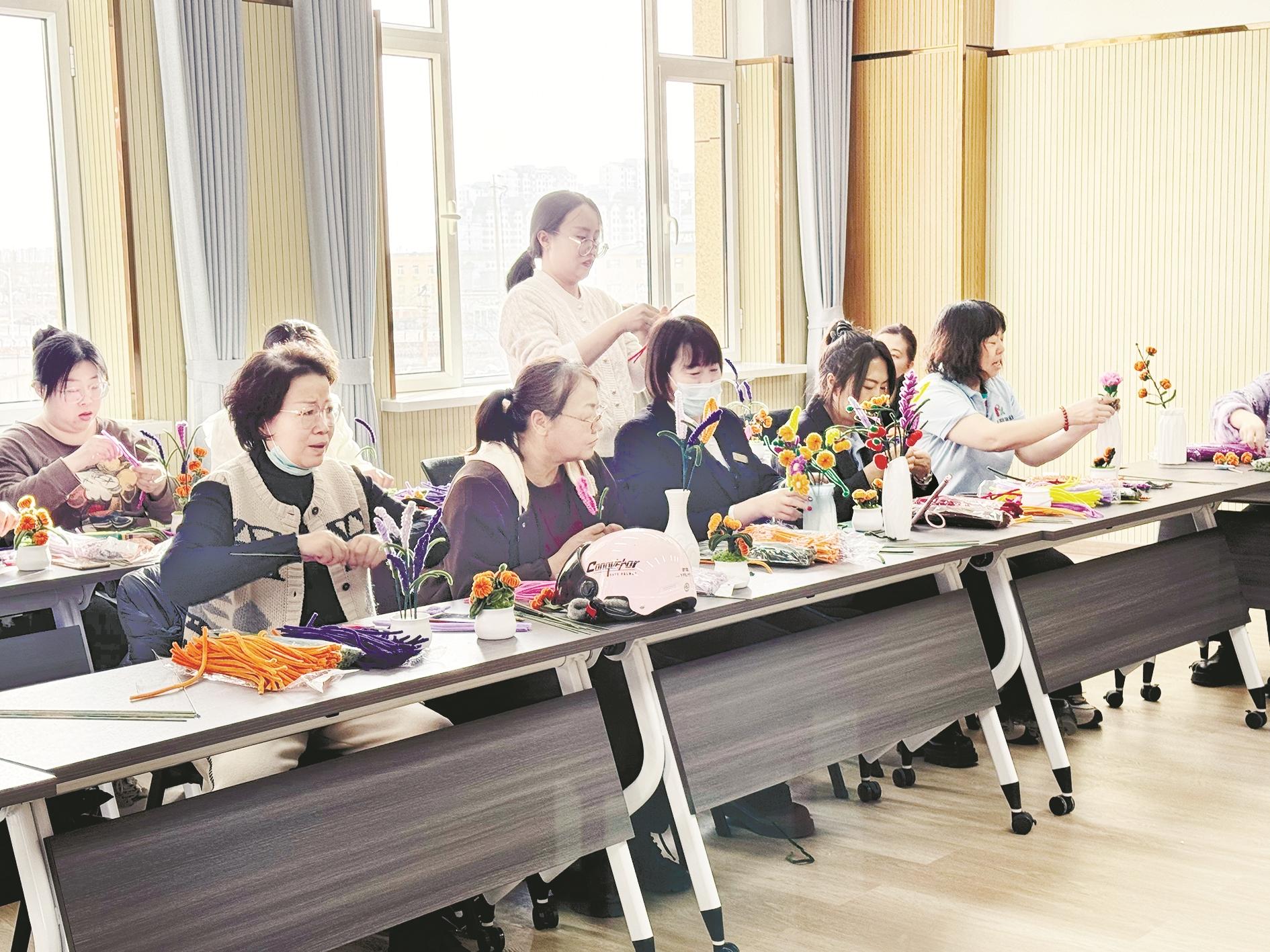 3月7日,海勃湾区新华西街道新华社区组织开展“妙手生花 熠熠芳华”庆三八·扭扭棒DIY手工制作体验活动。 (段维娜 摄)