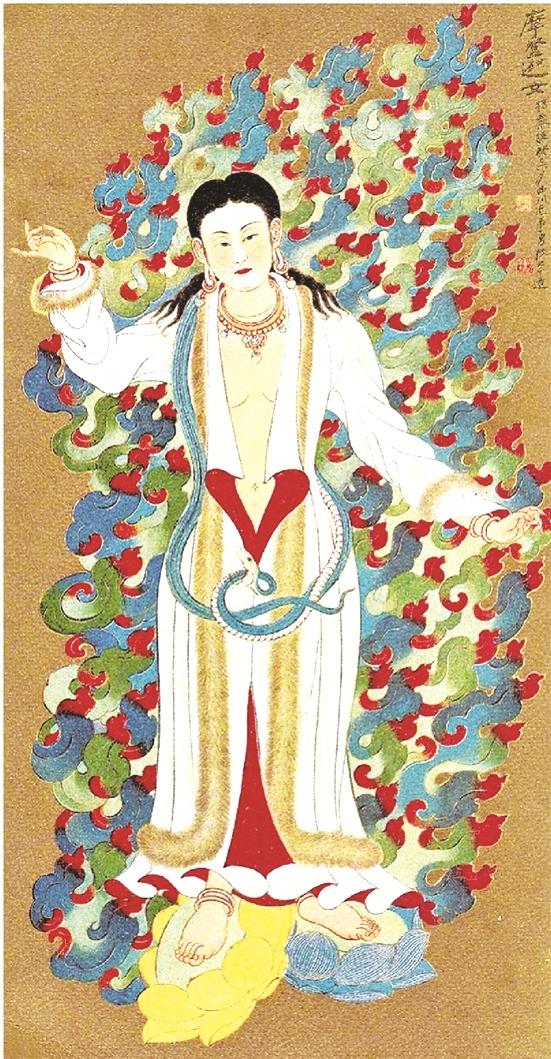 张大千选择《摩登迦女》印制成蛇年贺年卡,显然与主人公摩登迦女身上紧缠着一条青蛇有着密切关系。蛇在《圣经》故事中,是诱惑亚当、夏娃偷食禁果的主使;在东方佛经中,是情欲和诱惑的象征。但是,蛇的单一形象一般很难入画,且不无内容单薄之嫌。《摩登迦女》是张大千根据甘肃安西(今名瓜州)榆林窟内的壁画临摹而成,画面右上方,题识“摩登迦女。楞严经。癸巳六月,西川近事男张大千造”。主人公“摩登迦女”,本是古印度时期对种姓中最低贱女性的一种通称。据《楞严经》记载,摩登迦女原名缽吉蒂,偶遇释迦牟尼的大弟子阿难因口渴向她讨水,由此对阿难暗生爱慕之情,以致痴迷而不能自拔。后来,在佛陀的引导、教化下,终于摆脱孽缘,成为一位修行得道的比丘尼证得阿罗汉果。
