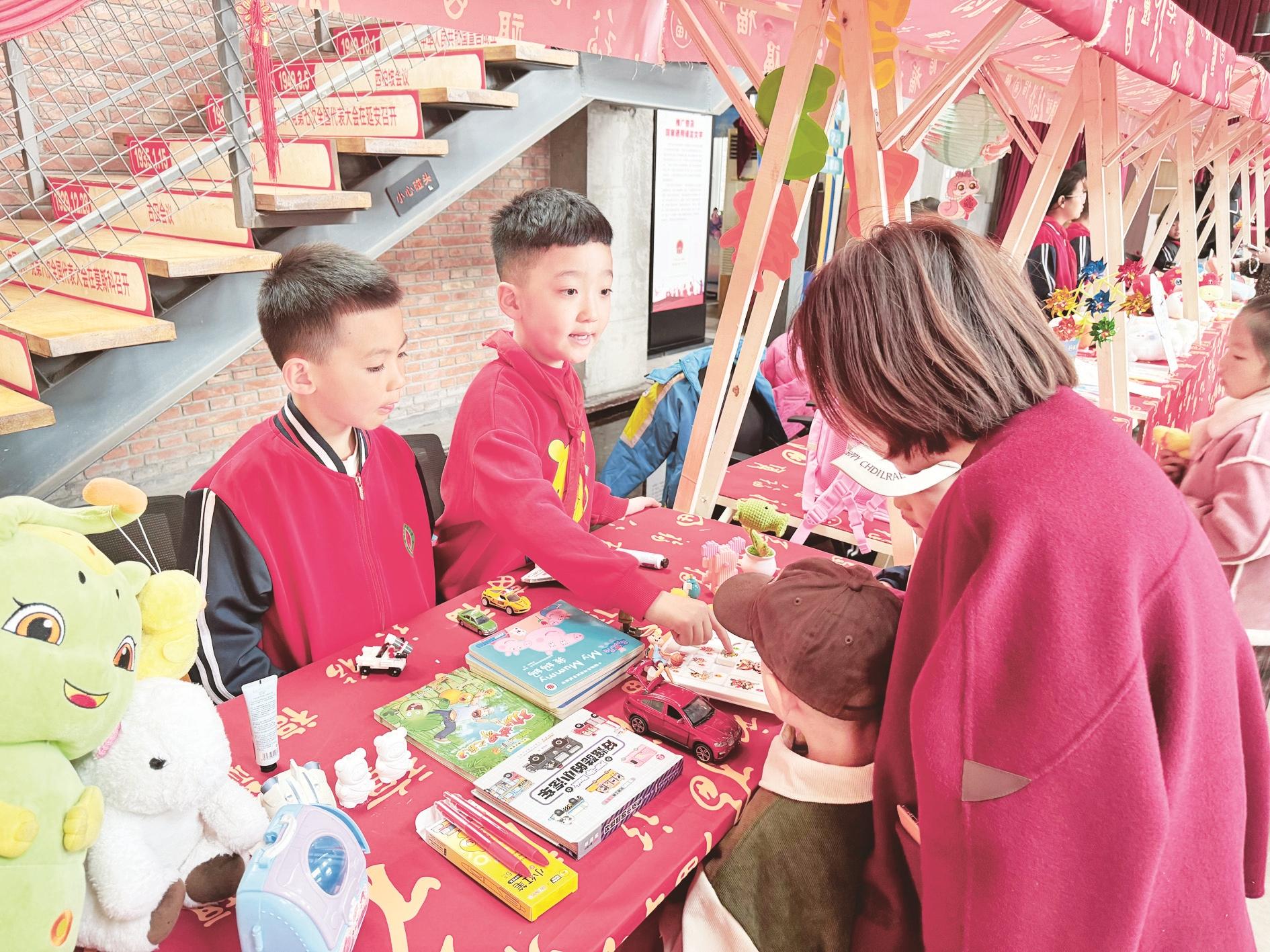 近日,乌海青少年创意园联合海勃湾区第五小学共同开展“闲置有爱 循环新生”学雷锋旧物集市活动,孩子们纷纷拿出自己闲置的书籍、手工艺品等进行买卖。现场摊位上的物品琳琅满目,创意十足、精彩纷呈。 (段维娜 摄)