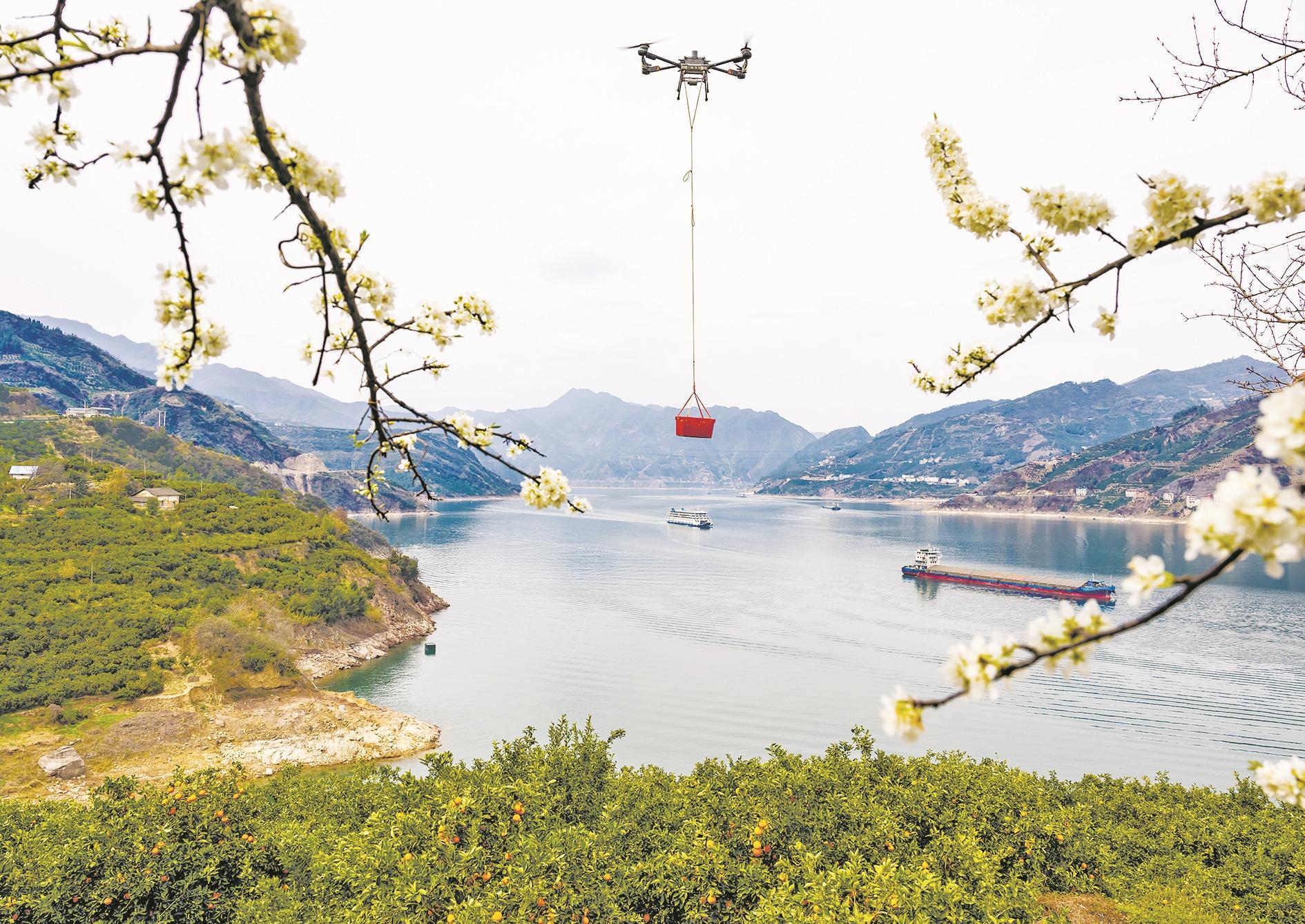 3月17日,湖北省秭归县郭家坝镇邓家坡村村民用无人机转运脐橙。眼下,三峡库区湖北省宜昌市秭归县5万多亩春季红肉脐橙丰收上市。近年来,该县持续加强脐橙产业品种改良,实现一年四季都有新鲜脐橙上市。目前,该县已种植脐橙40多万亩,脐橙成为当地果农增收致富的重要产业。 新华社发(郑家裕 摄)