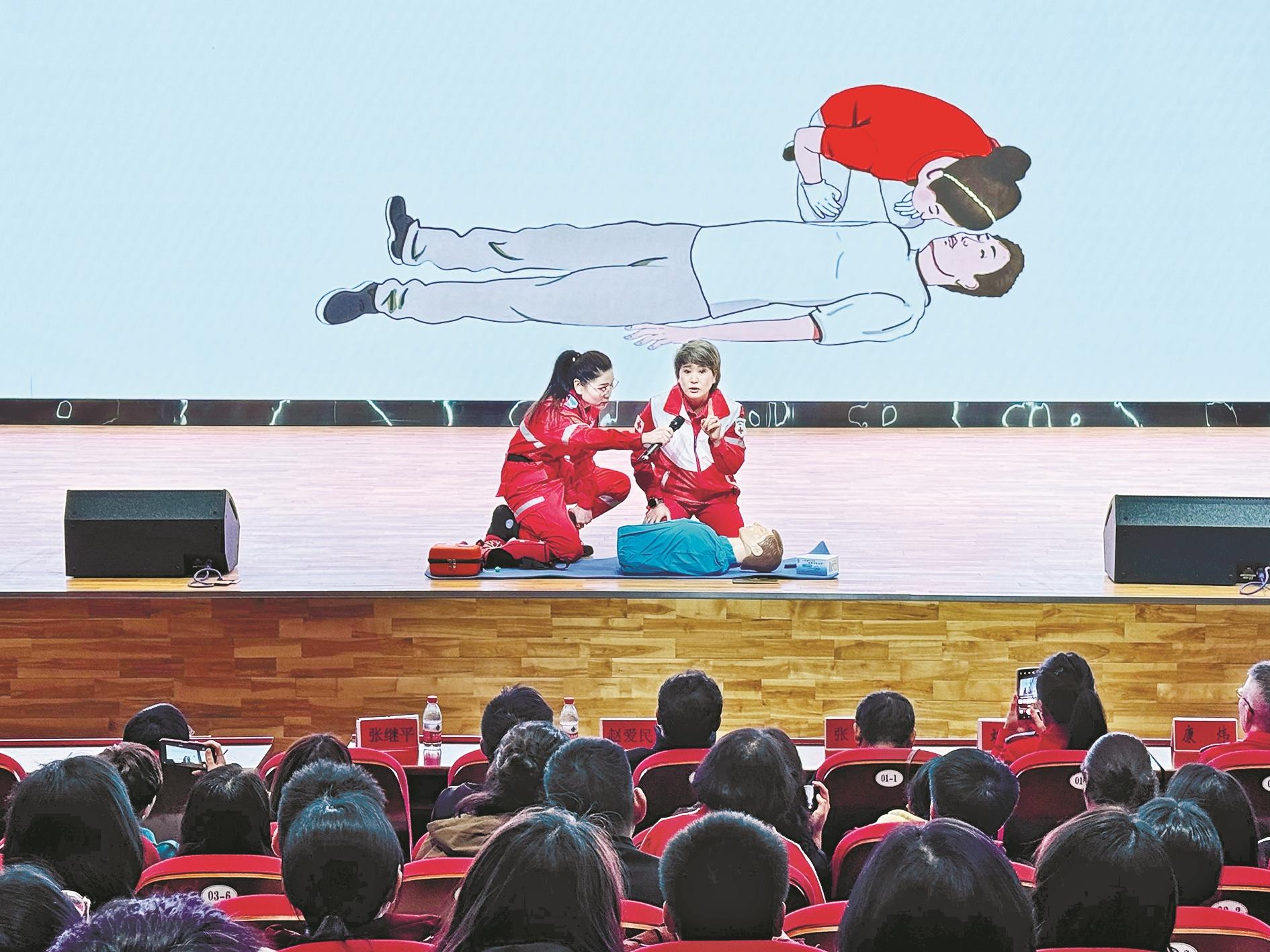 “进行心肺复苏,胸外按压部位要在两乳头连线中点,用手掌根部紧贴病人胸部,两手重叠,五指相扣……”3月20日,在市第一中学报告厅,身着制服的蓝天救援协会讲师正认真细致地向学校师生讲解最新版心肺复苏操作流程。