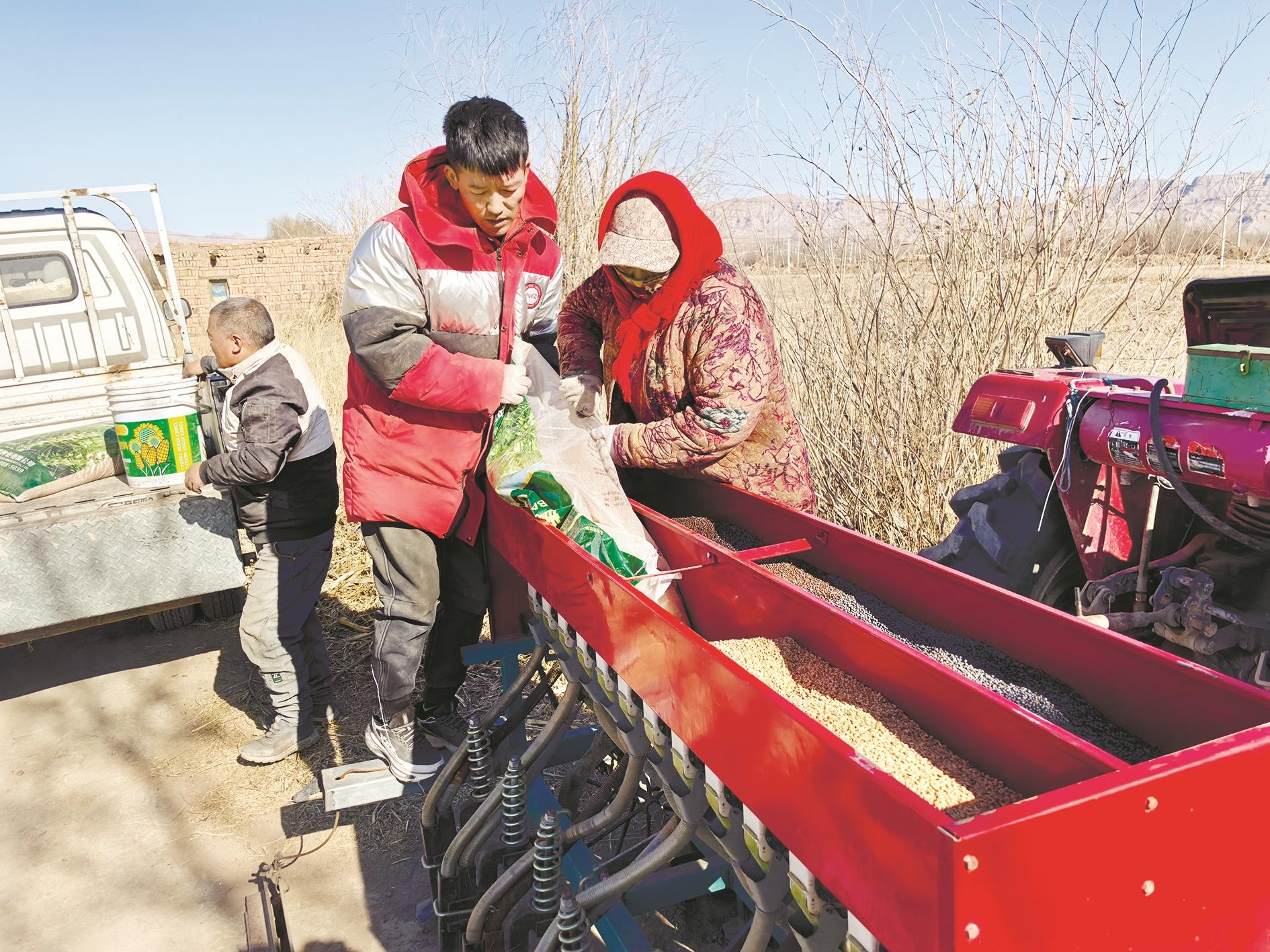 近日,乌兰淖尔镇开始春耕备耕工作,农区居民奔走于田间地头,忙着播种春小麦。图为村民操作播种机。 (张丽阳 摄)