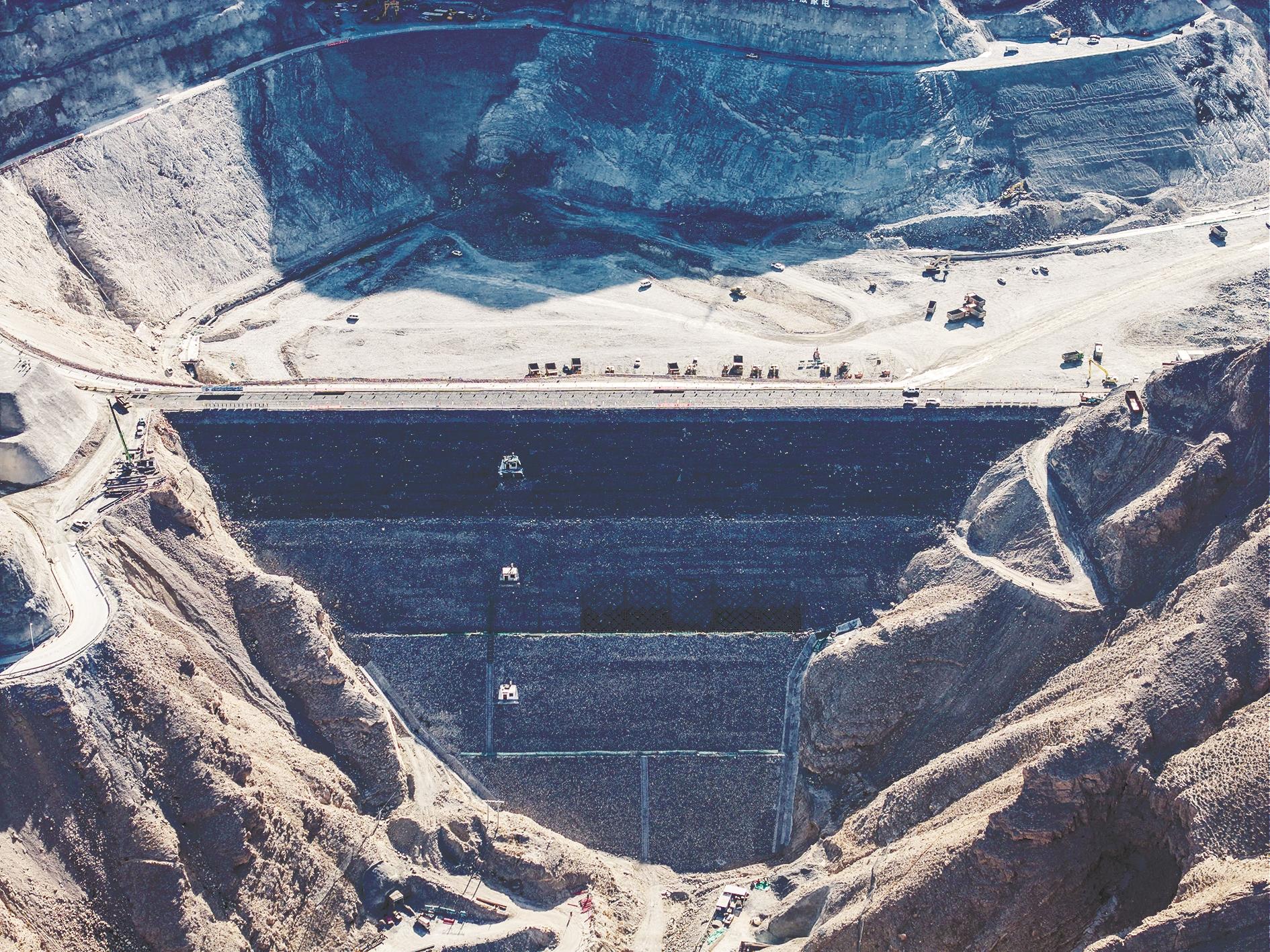乌海抽水蓄能电站枢纽建筑物主要由上水库、输水系统、地下厂房、下水库、地面开关站等组成,总装机容量为120万千瓦,设计年发电量约为20.08亿千瓦时。目前,上水库已完成大坝填筑施工,正在进行进出水口混凝土浇筑和库底排水廊道开挖、库盆垫层料填筑等施工;下水库已完成大坝填筑及环库路高边坡开挖支护施工,正在进行进出水口开挖和库底排水廊道开挖、混凝土浇筑等施工;地下厂房正在稳步推进主厂房、主变洞等关键部位的洞挖作业。按照计划,预计2026年10月,上、下水库具备下闸蓄水条件;预计2028年,地下厂房首台机组投产发电。图为建设中的下水库。