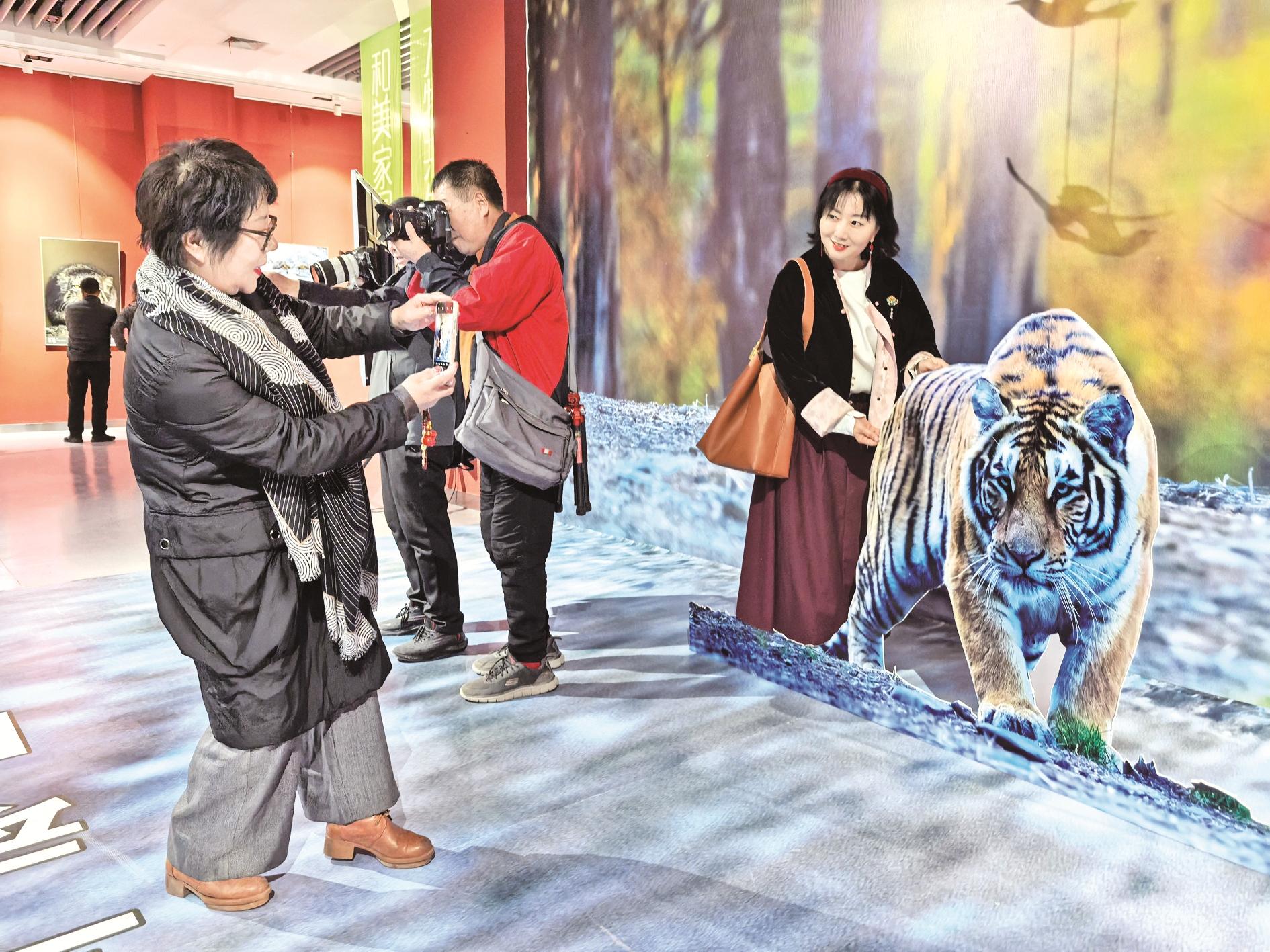 为了增加趣味性和互动性,展览还设置了打卡互动区、留言互动区。打卡互动区内参观者络绎不绝,在模拟自然环境的场景中,参观者仿佛化身为深入丛林的探险家,与野生动物来一场亲密接触,并用相机记录下这有趣的瞬间。