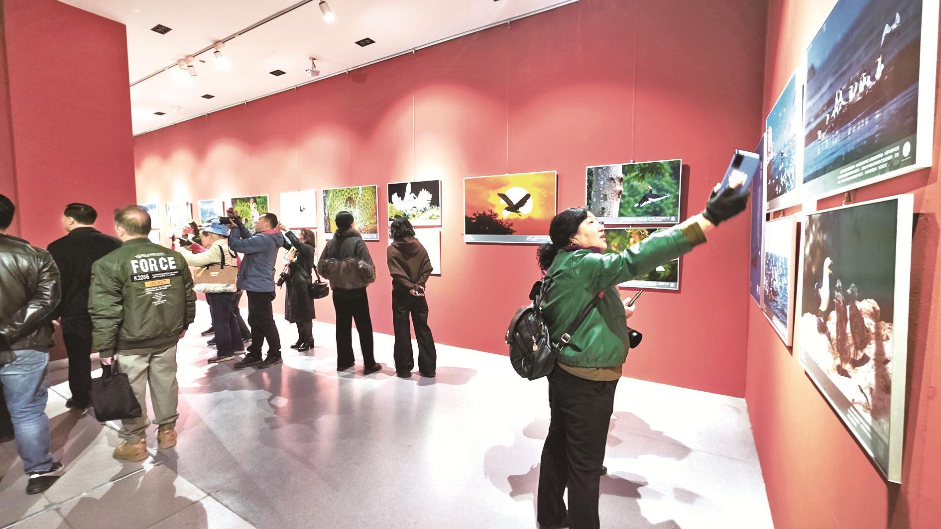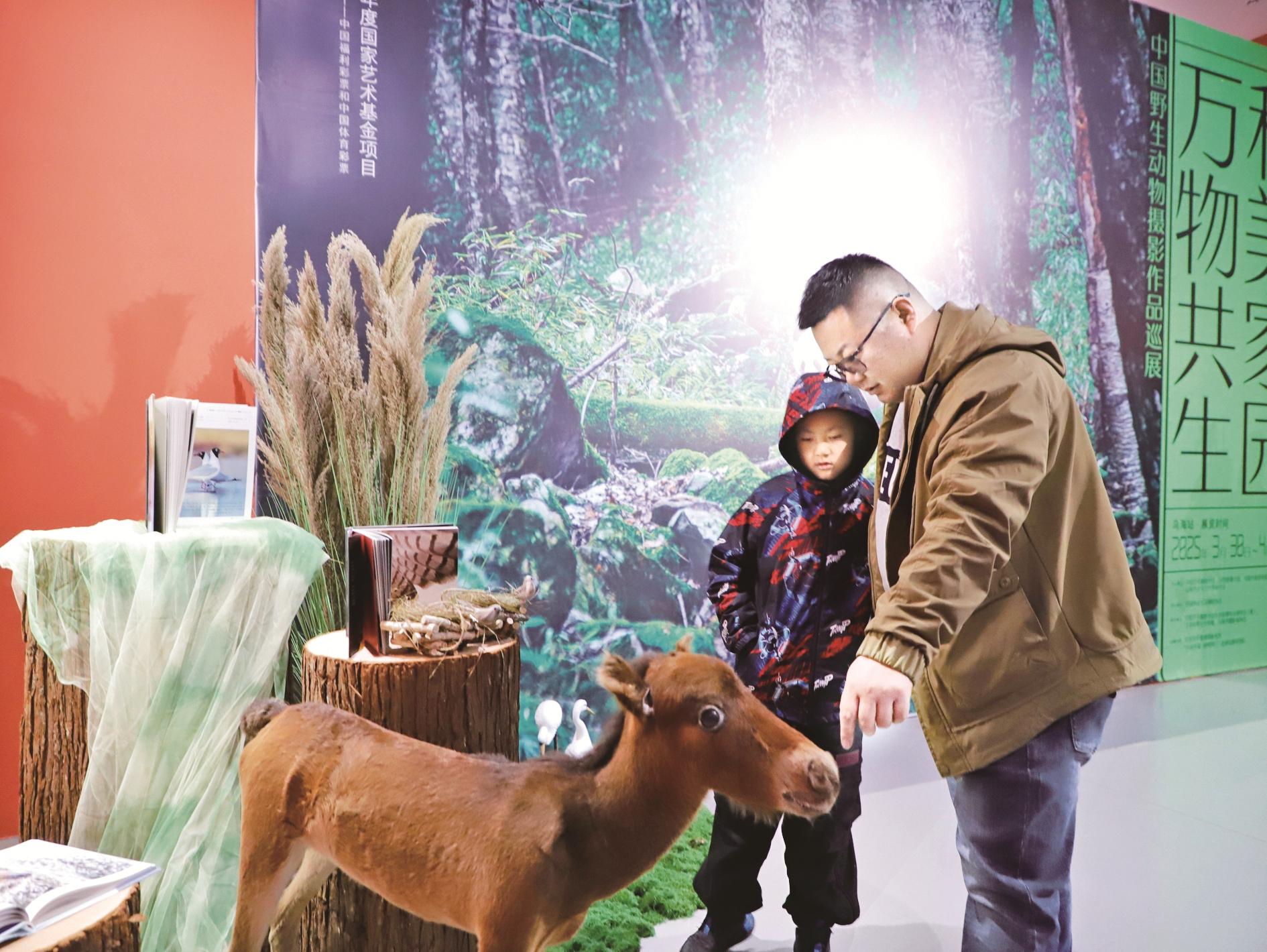 踏入展馆,160余幅精美摄影作品整齐陈列,这些作品聚焦哺乳类、鸟类、两栖爬行类、昆虫等国家重点保护野生动物,有的捕捉到动物们在广袤天地间自在觅食的悠然场景,有的定格了它们在丛林沙海间灵动穿梭的瞬间。从北国的冰原到南方的雨林,观众无需远行,便能领略全国各地珍稀野生动物的迷人风姿,沉浸式感受中国生物多样性的独特魅力。此次展览还展出了来自我市的20幅摄影佳作。6位摄影师用镜头将我市的生态之美娓娓道来。灰鹤在湿地翩翩起舞,岩羊在峭壁健步如飞,沙狐在沙丘间灵动穿梭,每一个画面,都记录着城市与野生动物和谐共生的动人故事,也为观众描绘出一幅独特的生态画卷。展厅内,观众们沉浸其中,时而驻足凝视,时而轻声交流。在这里,每张照片都是跨越物种与空间的桥梁,引导着人们与自然对话,聆听生命最本真的呼唤,激发出人们内心深处对野生动物的保护意识。