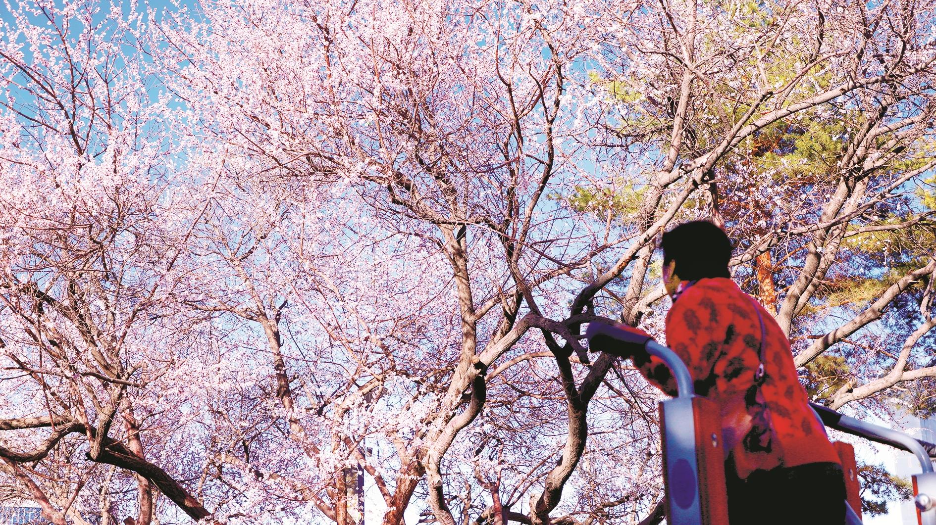 近日气温回暖,春花绽放,粉白色的花朵挂满枝头,生机盎然。市民在美景中畅享户外健身的乐趣,尽显春日蓬勃活力。图为市民在市人民广场的桃树下健身。(赵政宇 摄)