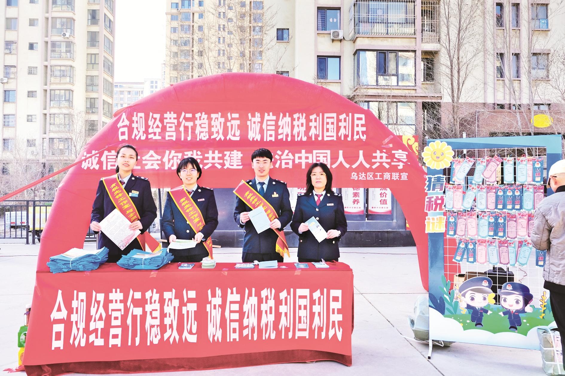 在海南区,乌海市海南区税务局“蓝色光”工作站兵分两路,一队发起联合宣传活动,集结公乌素辖区市场监督管理、综合行政执法、消防等部门一起走进国家能源集团煤焦化有限责任公司,以座谈形式现场答疑企业及职工关心的税收优惠政策享受、安全生产规范、合规经营等问题,让服务更高效,促进企业健康发展;另一队正在市冀蒙高级中学为师生们送上一堂生动有趣的税法知识课,课堂包含“税法宣传”“互动答疑”等环节,对税收概念、税种分类、税收的作用与意义等内容进行讲解,围绕生活中常用的税收知识展开讨论及有奖问答,让同学们在轻松愉快的氛围中领悟税收“取之于民,用之于民”的本质,深刻理解依法纳税不仅是公民的基本义务,更是支撑国家建设、保障民生福祉的重要基石。