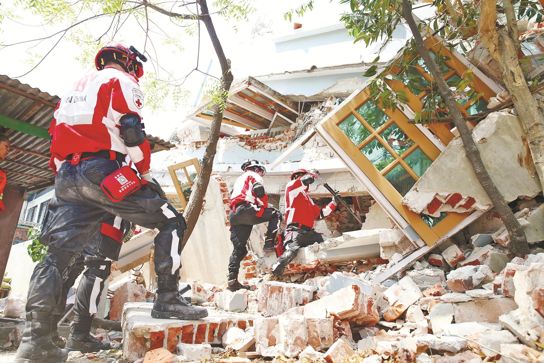 3月31日,中国红十字国际救援队队员在缅甸曼德勒开展救援。当日,中国红十字国际救援队接到缅甸曼德勒当地求救信息,赶赴现场救援。 新华社发(苗觉梭 摄)