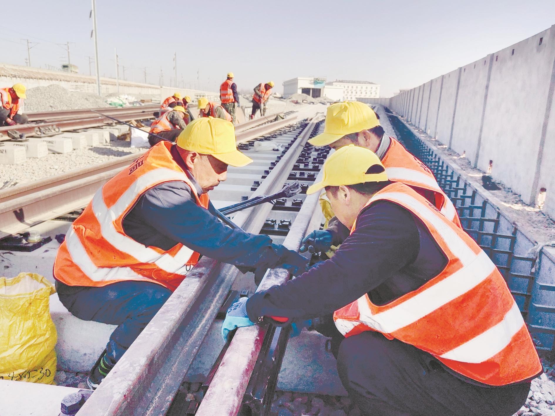 包银高铁是我国首条连接两个少数民族自治区的高铁线路,其中,乌海段全长50.8千米,设乌海站、乌海南站2座车站。图为在包银高铁乌海站附近,中铁二十局集团有限公司包银高铁工程项目经理部铺轨工班作业人员正在进行铁路道岔组装工作,为后续铺轨施工创造有利条件。 (黄建飞 摄)