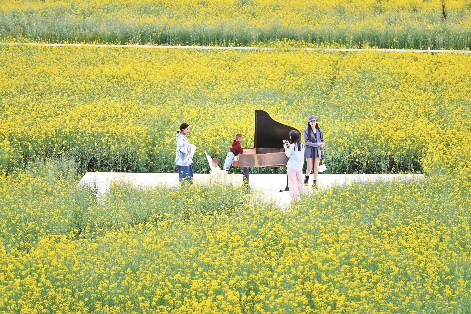 4月7日,游客在桐庐县梅蓉村油菜花田内游玩赏花。近日,位于富春江畔的浙江杭州桐庐县桐君街道梅蓉村千亩油菜花田迎来最佳观赏期,吸引不少游客前来观光、休闲。