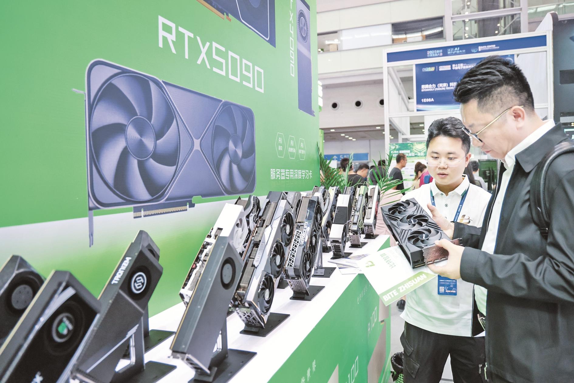 4月9日,观众在第十三届中国电子信息博览会上了解一款显卡。当日,第十三届中国电子信息博览会在深圳会展中心(福田)开幕。展会以“科技引领,‘圳’聚创新”为主题,聚焦智能终端、光电显示、人工智能、大数据存储、基础元器件、低空经济等前沿重点领域,吸引了超千家企业参展。