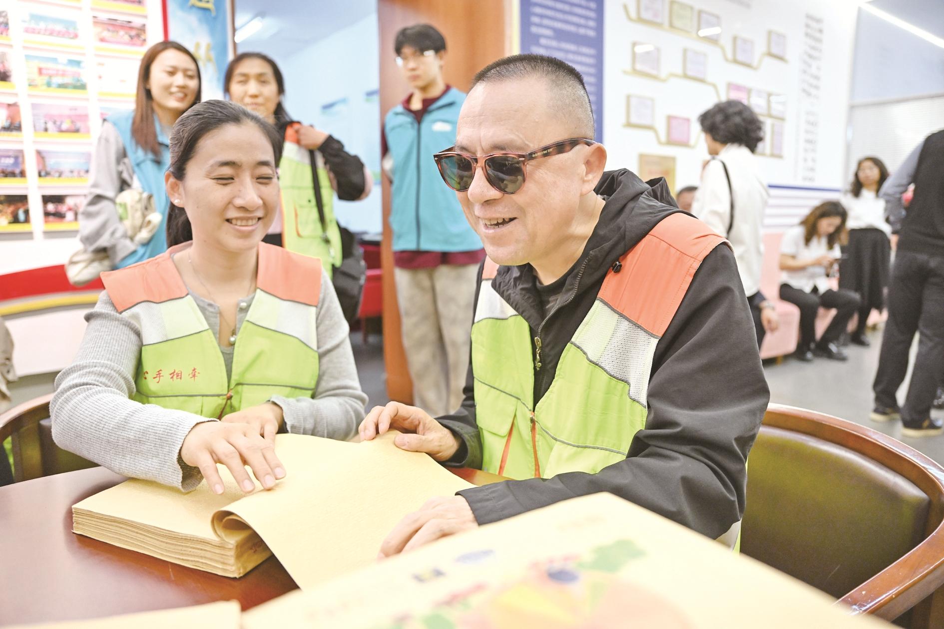 4月14日,视障人士在内蒙古包头市图书馆“阅读”盲文书籍。近年来,内蒙古包头市图书馆为残障人士服务,在市残联的支持下积极开展“心手相牵·悦读世界”“畅听微阅读”等活动,同时不断完善无障碍设施建设及盲文图书储备,通过志愿者为残障人士提供“你读我听”无障碍电影放映、讲播等服务,丰富当地残障人士文化生活。 新华社记者 贝赫 摄