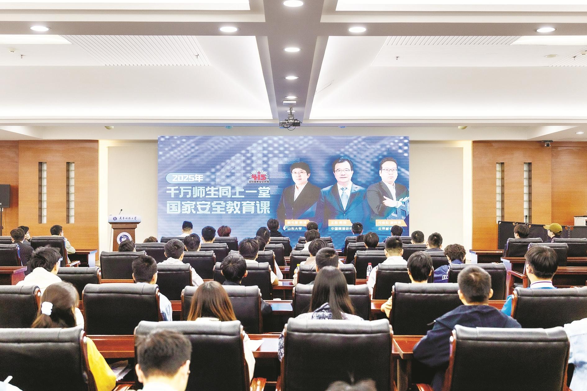 4月15日,天津科技大学的师生在观看“千万师生同上一堂国家安全教育课”。4月15日15时,由教育部思想政治工作司指导,中国大学生在线录制的“千万师生同上一堂国家安全教育课”面向全国高校师生推出。来自山东大学、中国南海研究院、北京邮电大学的专家教授,在总体国家安全观刘公岛教育培训基地、海南省三沙市永兴岛、北京邮电大学网络安全中心,以实景课程录制的形式,分别围绕总体国家安全观、国土安全、网络安全等领域,结合高校实际,立足学生视角,用真实生动的案例讲述了国家安全与高校师生密切相关。 新华社发