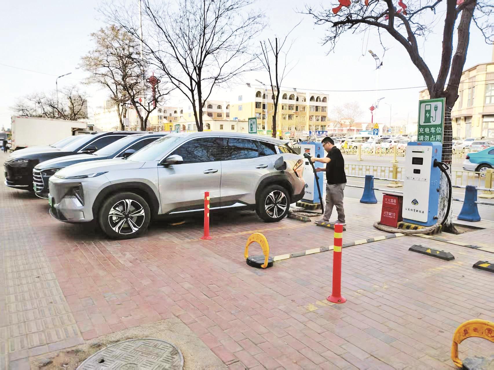 随着汽车以旧换新、置换更新等政策的落地,我市新能源汽车越来越多。为方便新能源汽车用户,我市积极支持新能源充电站建设与运营,为群众绿色出行提供便利。图为近日新能源车主在海勃湾区新天地市场外围为汽车充电。