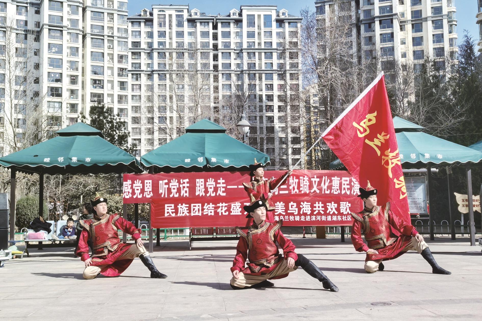 近日,乌海乌兰牧骑联合海勃湾区滨河街道湖东社区开展了“民族团结花盛开 和美乌海共欢歌”惠民演出活动。活动中,文艺志愿者表演了歌舞、合唱、诗朗诵、乐器演奏等节目,让各族群众感受了一次“沉浸式”的北疆文化熏陶。
