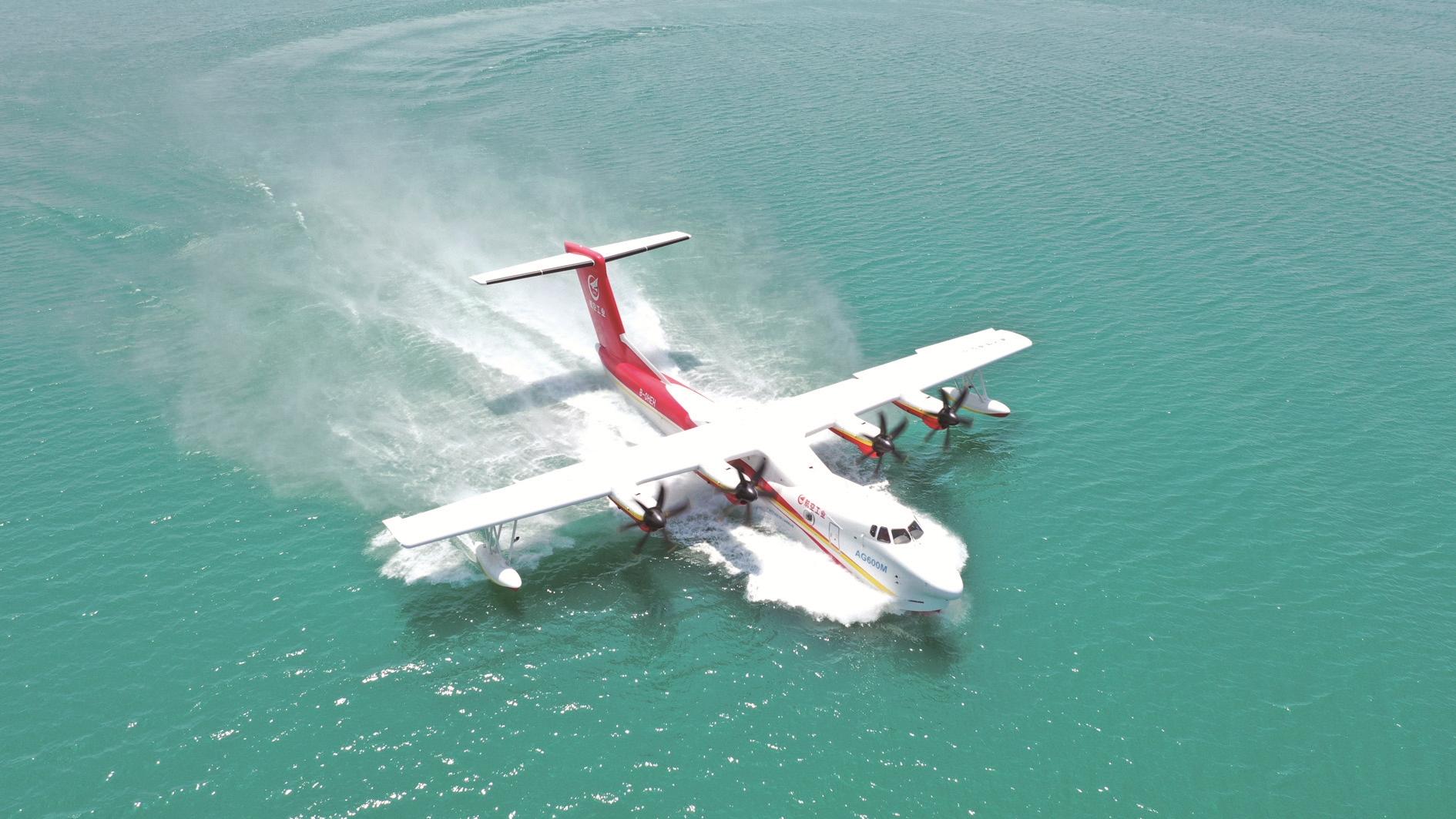AG600飞机在湖北荆门开展水上科目试飞(2023年4月摄)。4月20日,我国首次按照中国民航适航规章完全自主研制的大型水陆两栖飞机AG600“鲲龙”获得中国民航局颁发的型号合格证,标志着全球起飞重量最大的民用水陆两栖飞机通过了严格测试和验证,研制取得圆满成功,获得市场“准入证”。AG600飞机有低空低速性能好、灭火救援效率高、水面飞行起降稳、执行任务领域广、技术领先独立、全面国产化配套等优势。