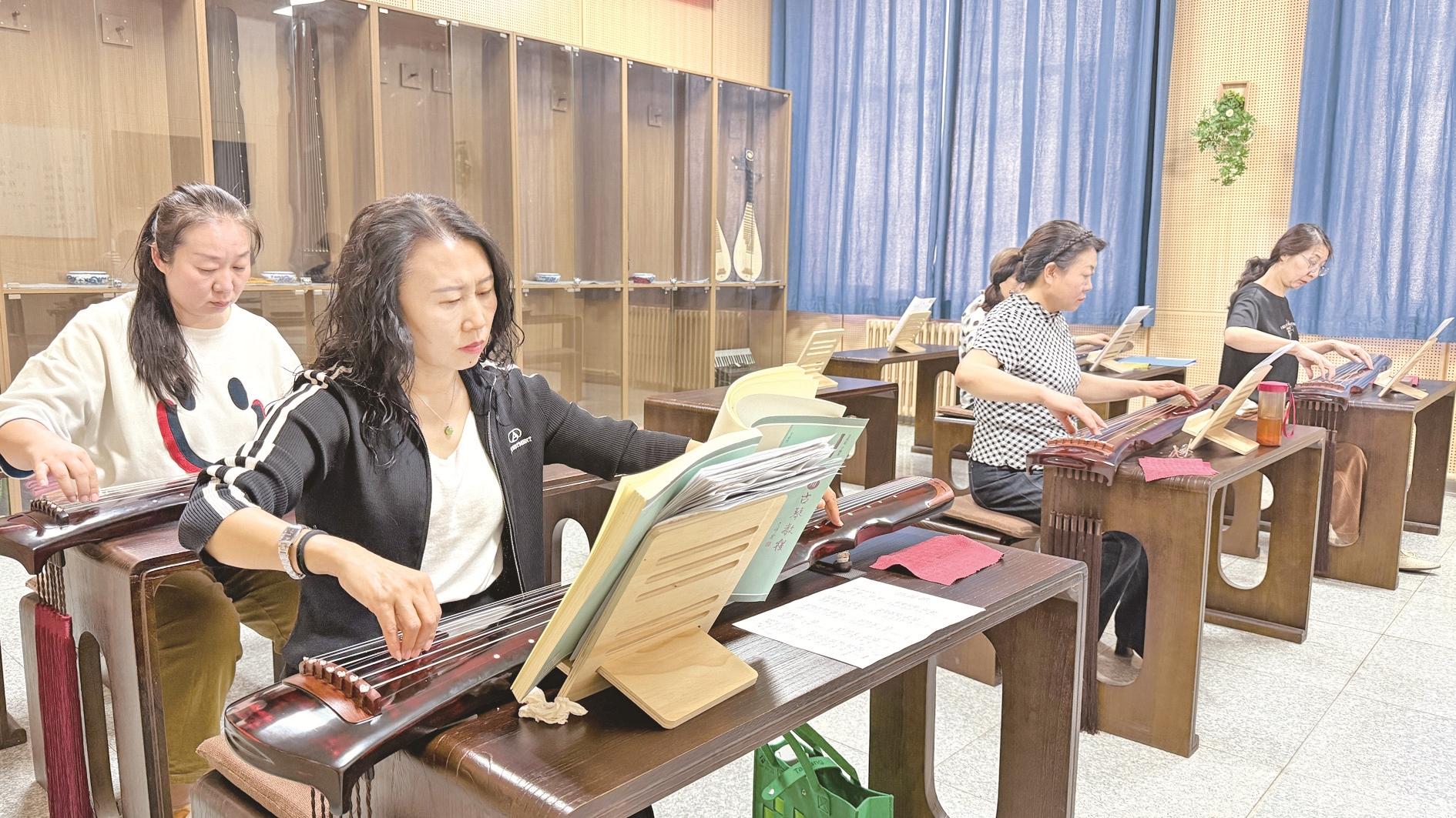 近日,乌达区文化馆开设了各类免费文化课程,市民们积极踊跃报名学习。图为市民学习古琴。 (张丽阳 摄)